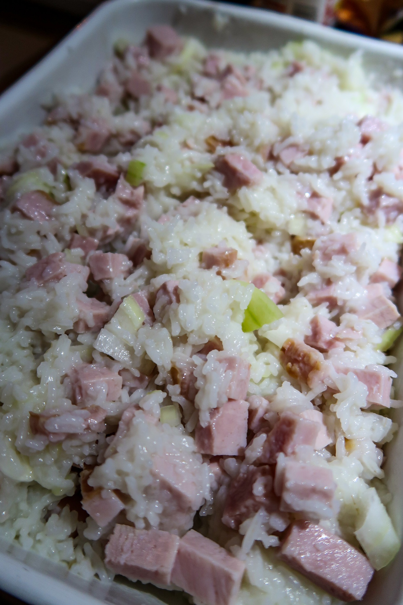 1) Sätt ugnen på 225 grader. Koka riset enligt anvisningar. Skär kasslern i tärningar. Skala och hacka löken. Blanda allt: ris, kassler och lök i en ugnsfast form.