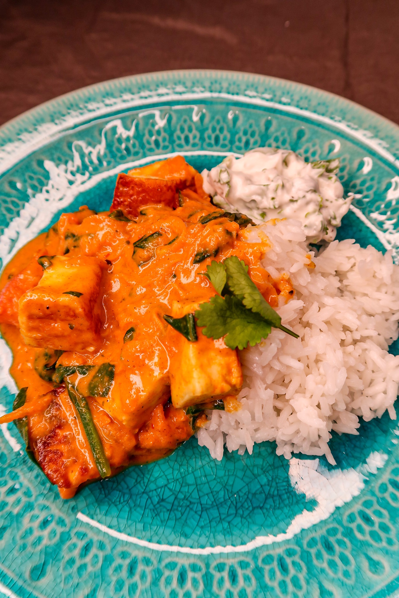 6) Ha i halloumi i tikka masala bladningen och låt den röra med tills den blandats ordentligt. Servera med ris och koriander yoghurt.