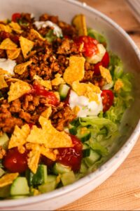 Äääälskar den här tacosalladen, den är verkligen så så god! Fräscht och samtidigt enkelt att svänga ihop dessutom. Variera proteinet om du vill. Jag varierar med allt från köttfärs, kycklingfärs, vegofärs till linser.