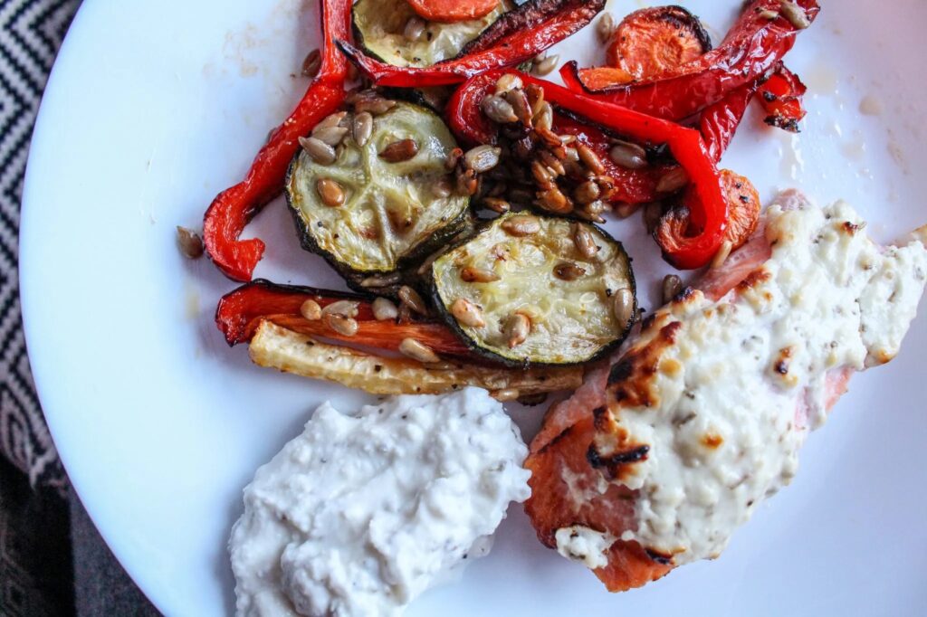 Lax med fetaosttäcke och ugnsrostade grönsaker