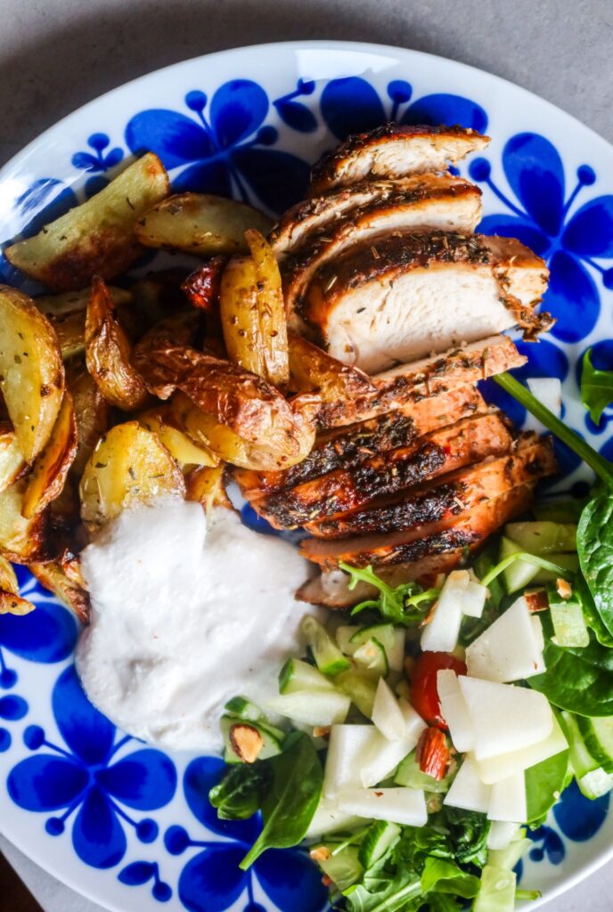 Supergod kyckling med klyftpotatis och kall citron & kokossås