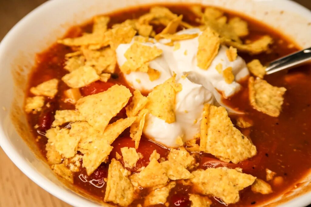 Den här tacosoppan älskar jag. Den är så god med de krispiga tortillaschipsen i, så gott att avnjuta denna creme fraiche till, nej men så gott.
