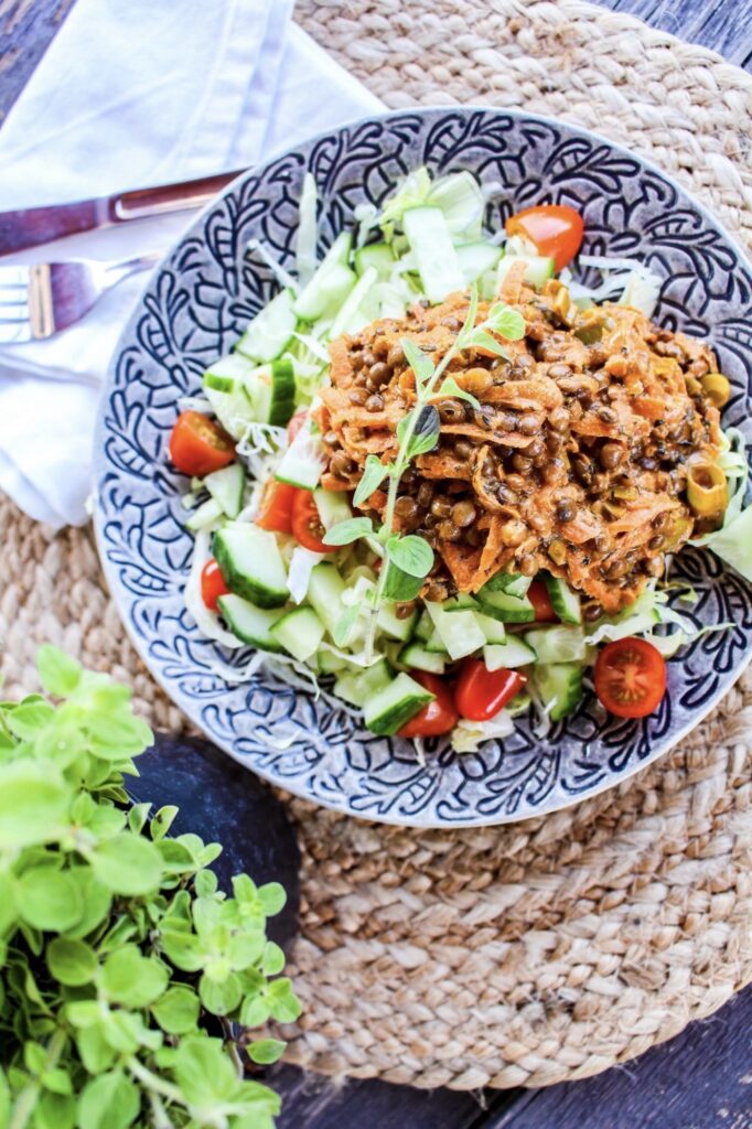En mustig linsbolognese med morötter, salladslök och kryddor – perfekt som vegostart på veckan. Servera med pasta.