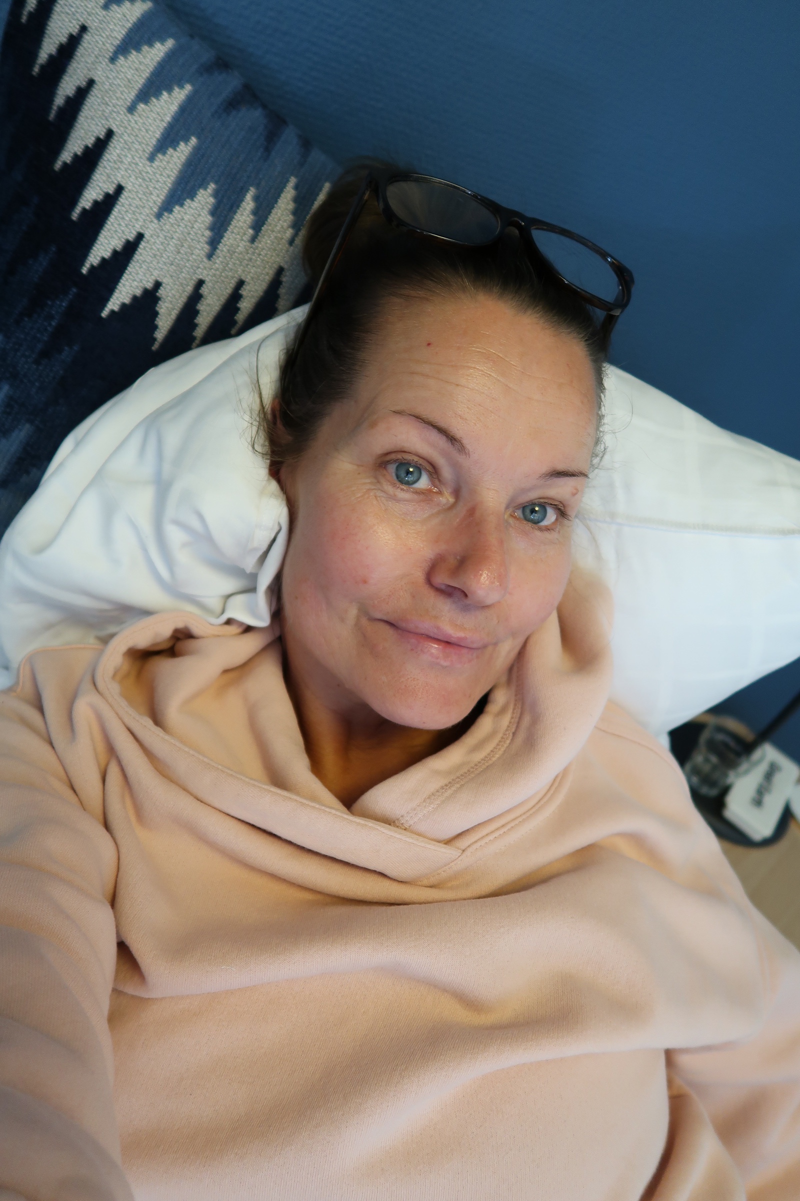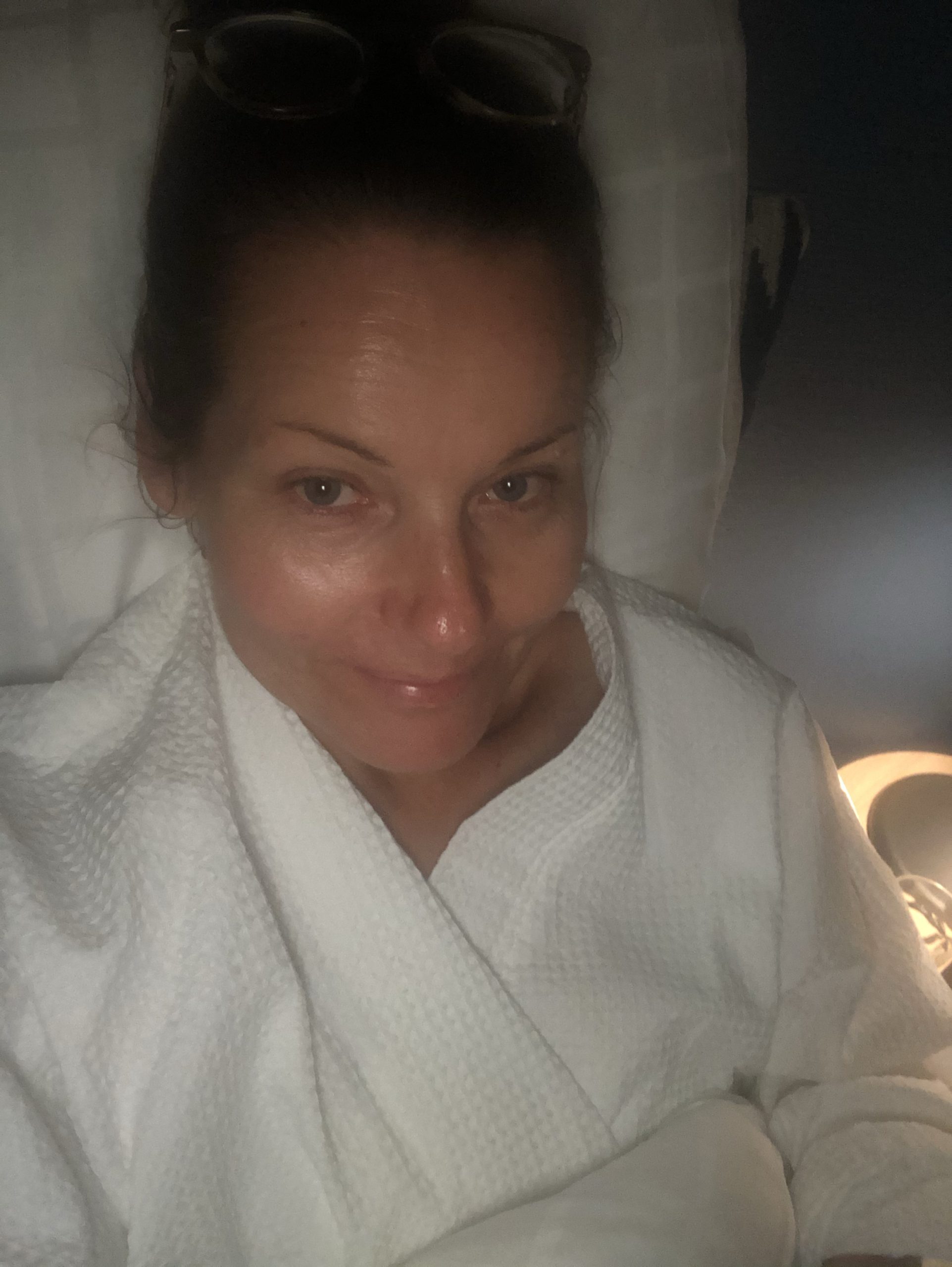 Suddig och trött i sängen igår kväll. Mysigt att ta på sig en morgonrock och bara mysa ned sig. Somnade rätt snabbt efter den här bilden togs. Sov som en stock inatt. Vad upp och kissade en gång men sen kändes det som jag var helt klubbad. Så skönt och välbehövligt!