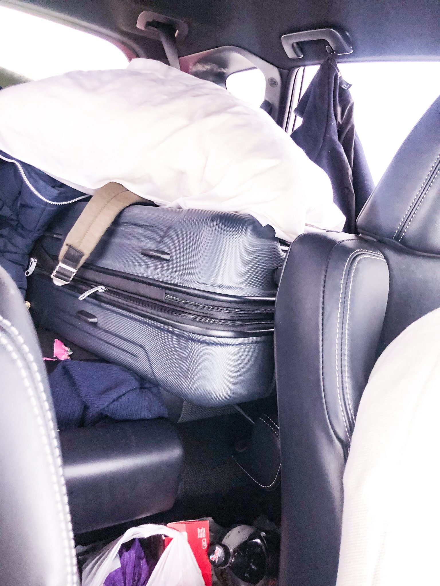 Bilen är packad upp till taket här och Tony sitter med jobblurarna redo. Milo sitter i baksätet och kollar film. Jag jobbar här bredvid.