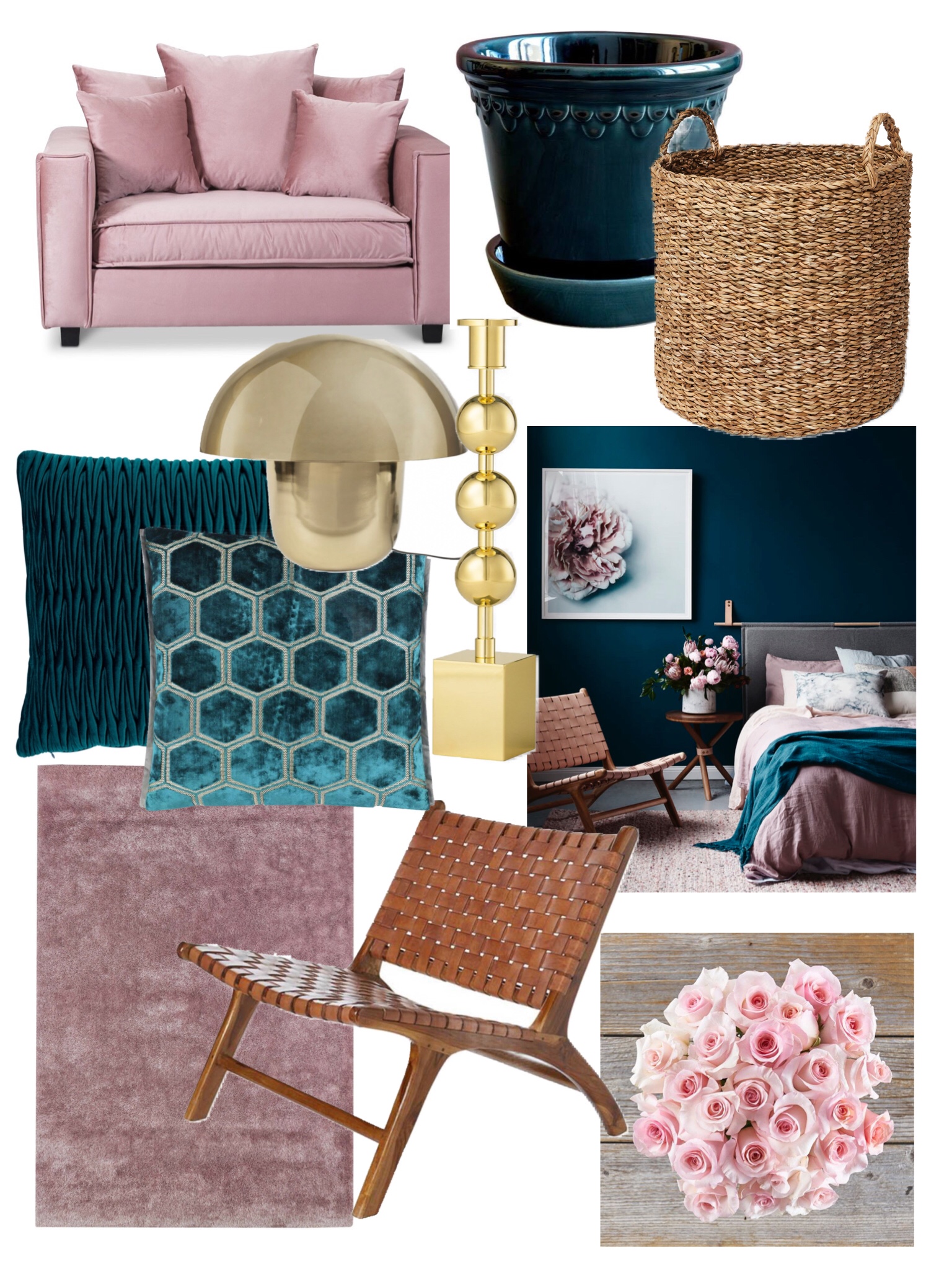 Här är det ett mer vågat sovrum som efterfrågas. Här har man tagit ut svängarna lite mer och använder färger med lite mer kontrast. Man har vågat gå all in och blanda rosa med petrol. Till det har man blandar in lite naturfärger och mässing. Riktigt häftigt tycker jag!