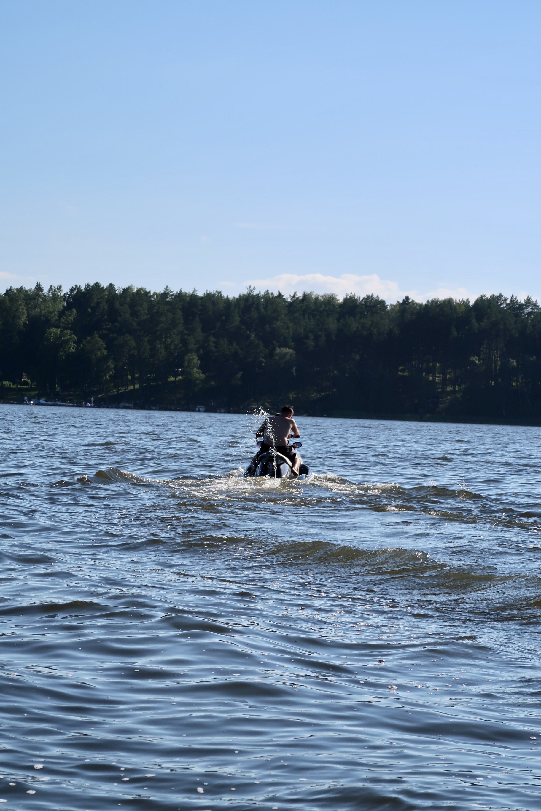 Mitt emot stranden vi var på finns en ö som heter Bryggholmen. Där har mina stora barns farmor o farfar sin sommarstuga. Thedde hade varit och lånat båten och sök upp också. Här på en vattenscooter som Milo fick åka med på också. Höjdare!