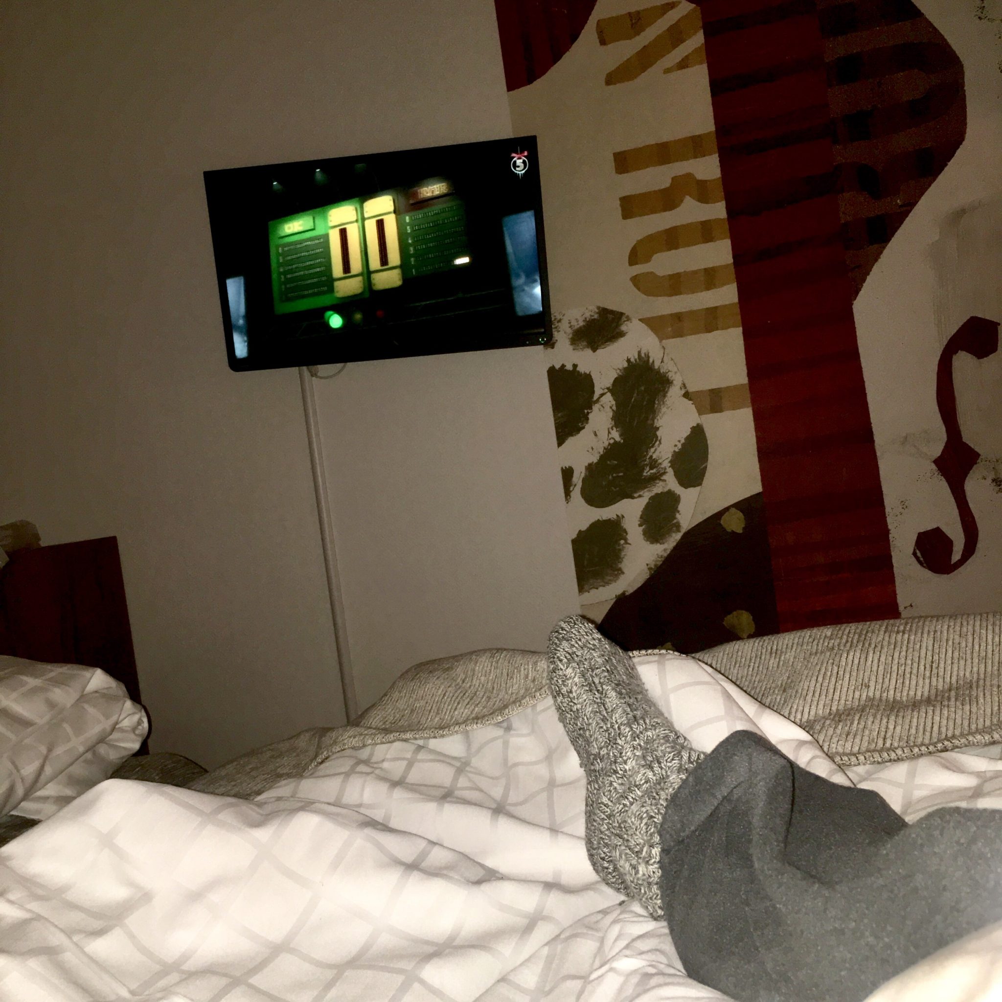 Här ligger vi nu. Jag har ätit middagen här inne på rummet lyxigt nog. Så skönt att inte behöva röra sig ur fläcken.