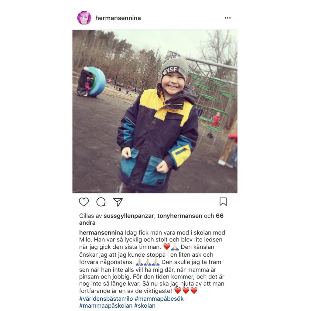 Såhär är det ju också. Ja såhär som jag skrev på min Instagram. Det är inget självklart längre, varje dag som jag fortfarande är den viktigaste personen i hans liv känns dyrbar och viktig. Jag värnar om dessa dagar som om det vore renaste av guld. Jag vet nämligen hur fort det förändras. Ni vet när den där pussen på skolgården när man säger hejdå börjar kännas pinsam, om mamman skrattar för högt eller pratar för mycket är man jobbig. Ska man med till skolan och sitta i klassrummet, ja då döööööör dom ju av pinsamhet…… men inte riktigt än. Även fast man som 8 åring vill vara cool så är mamma och pappa fortfarande bäst och tryggast. Så ja, jag njuter i stora lass.