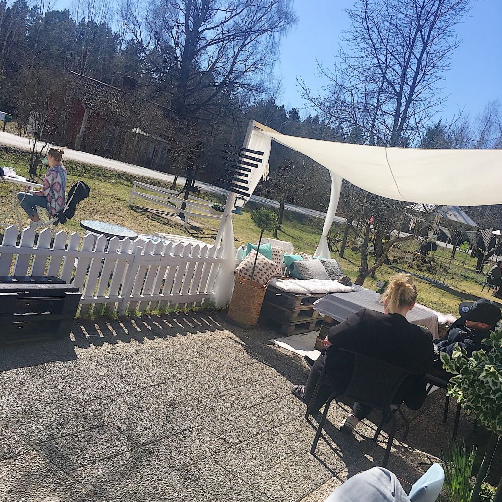 Såhär såg det ut på eftermiddagen, en bild jag lyckades ta utan att visa ansiktet på någon av gästerna. Myshörnan där borta under segelduken är superpoppis. De som satt där hade just lämnat stället…men oftast är det någon som sitter där. Jag VISSTE att det skulle bli ett favvoställe. Solsängen som vi snickrade ihop är också en favoritplats har vi märkt. Gäster som sittligger tillsammans, gäster som ligger där i sin ensamhet med en kopp kaffe. Så mysigt! Imorgon ska jag visa mer bilder från uteplatserna.