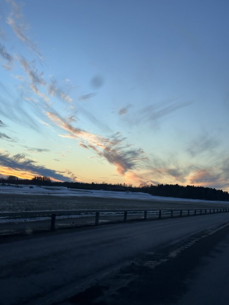 Igår när jag åkte hem till mamma & pappa möttes jag av den mest magiska himlen. Den där sortens solnedgång som får hela vinterlandskapet att kännas som ett vykort. Rosa, guld, blått. Snö som glittrade. Jag älskar sådana stunder och alltid lika svårt att få med på bild, men jag försökte i alla fall.