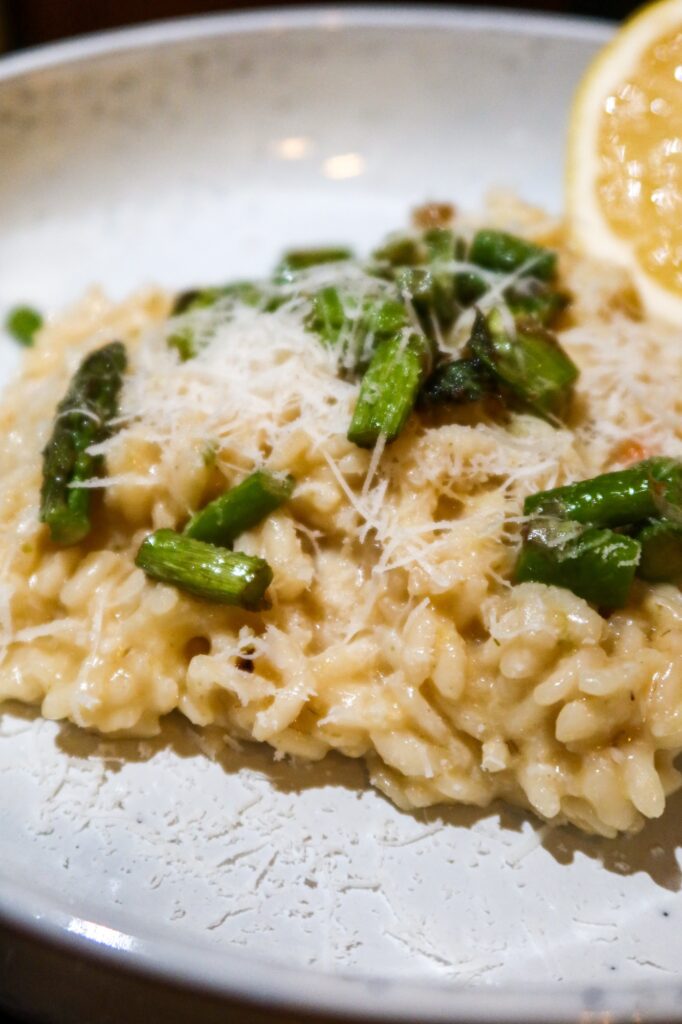 4) När riset nästan är klart, vänd ner sparris. Dra av från värmen och rör ner smör, ost och citron.