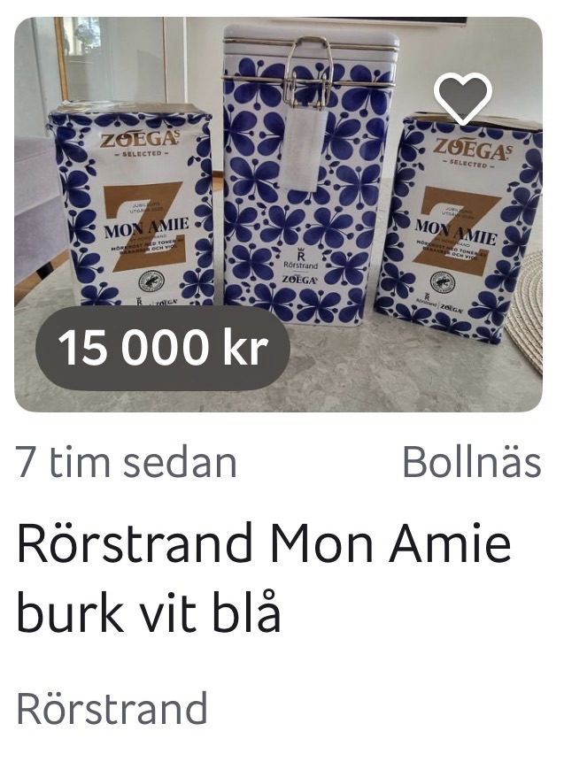 Alltså va? Den här burken får man alltså gratis när man köper 2 paket Zoega kaffe som har MonAmie papper på sig. Nu sitter folk och försöker få 15-19 tusen spänn för burken!