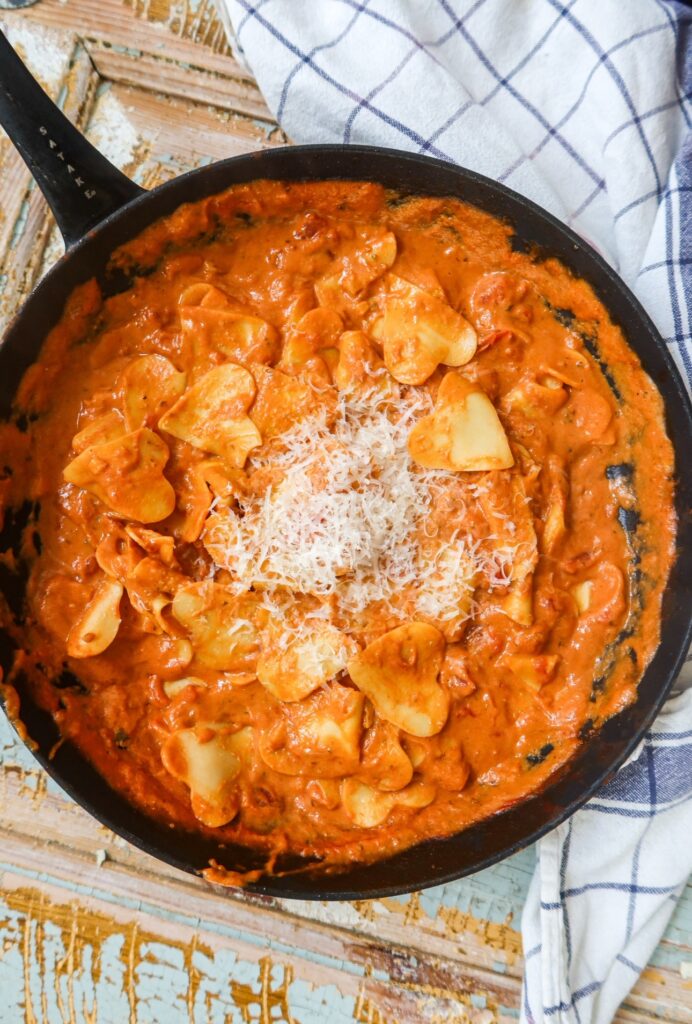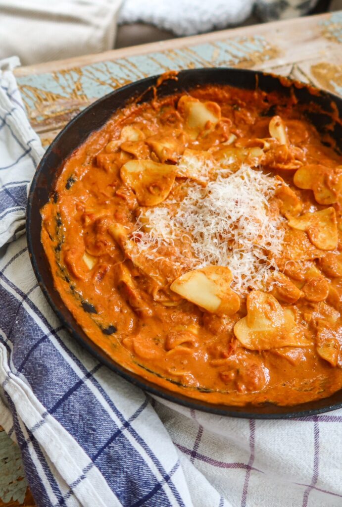 Den här godingen som jag lagade för någon vecka sedan hade jag nästan glömt bort, den gjorde i alla fall succé här hemma. Alla åt så dom sprack. 😂 Ibland är det så skönt att bara laga något snabbt, enkelt som ändå är alldeles ljuvligt gott. Den här tomatpastan med hjärtformad färskpasta är just det, vardagslyx på bara några minuter! Jag stansade ut hjärtan av färska lasagneplattor (lite pilligt men så värt det för hjärtana var verkligen pricken över i:et), kokade dem snabbt och rörde ihop en mild, gräddig tomatsås som blev magiskt krämig till.