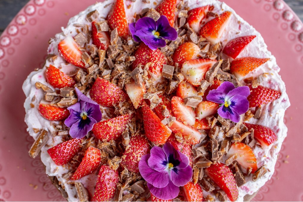 3) Ta understa delen av botten och lägg på ett tårtfat. Bred över gräddblandningen. Lägg på nästa botten och gör likadant. Avsluta med gräddblandning på toppen, klyftade jordgubbar och 1 hackad dubbeldaim.