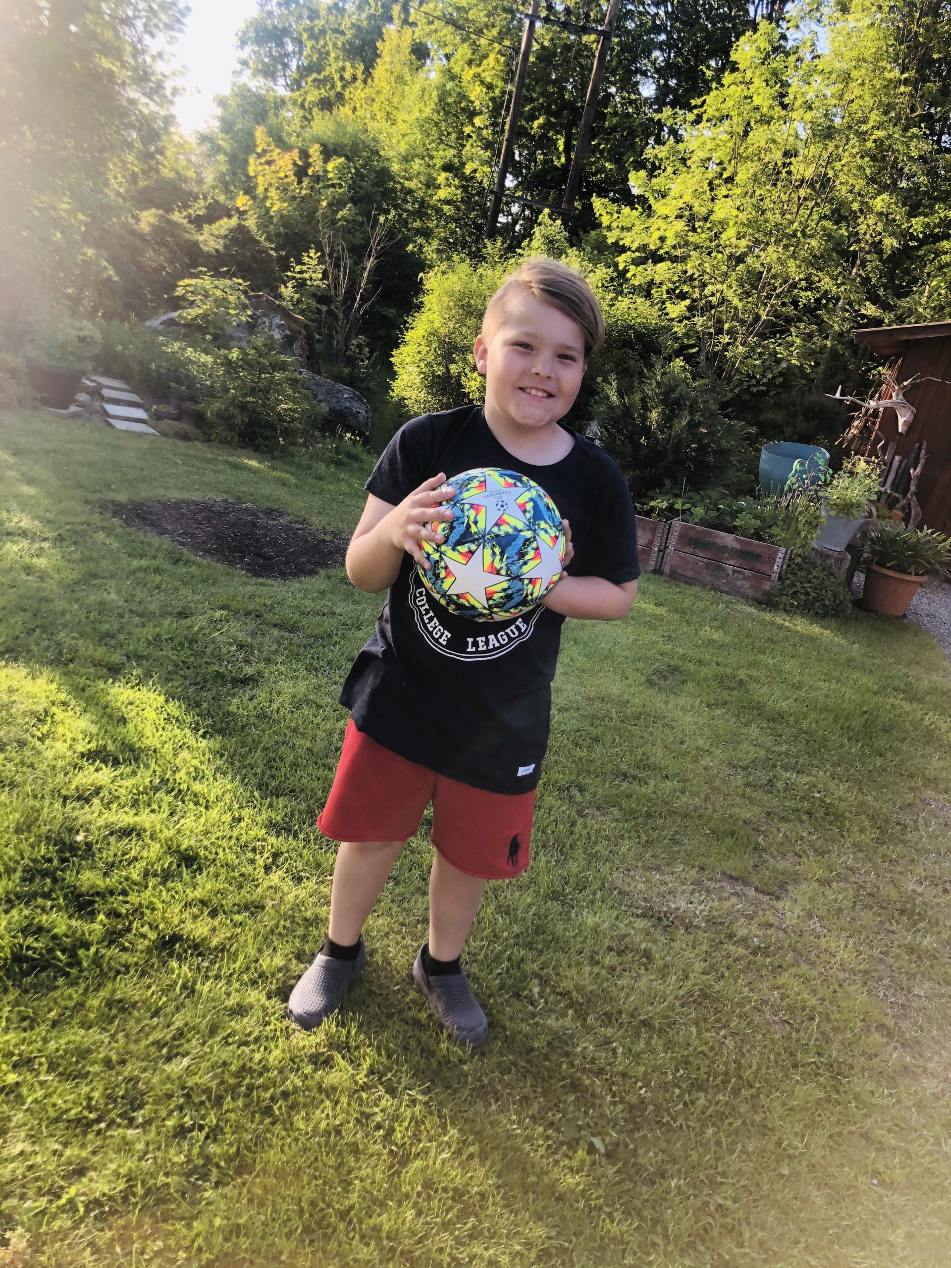 Det var fotboll i trädgården efter kompis Neo åkt hem. Milo köpte en ny fotboll idag, tror det är den 147:e faktiskt. Men vad säger man då? Han spar ihop pengar och så handlar han saker för dem, då har man inte mycket att säga till om ju. Stackarn har fått såna jäkla skavsår av fotbollsskorna så han får glida runt i tofflor nu när de är som värst. Minns ni skavsåren man fick när man var mindre? Jag minns dom som igår? Helt galna för tusan! Stora vidriga blaffor som sprack och gjorde så satans ont.