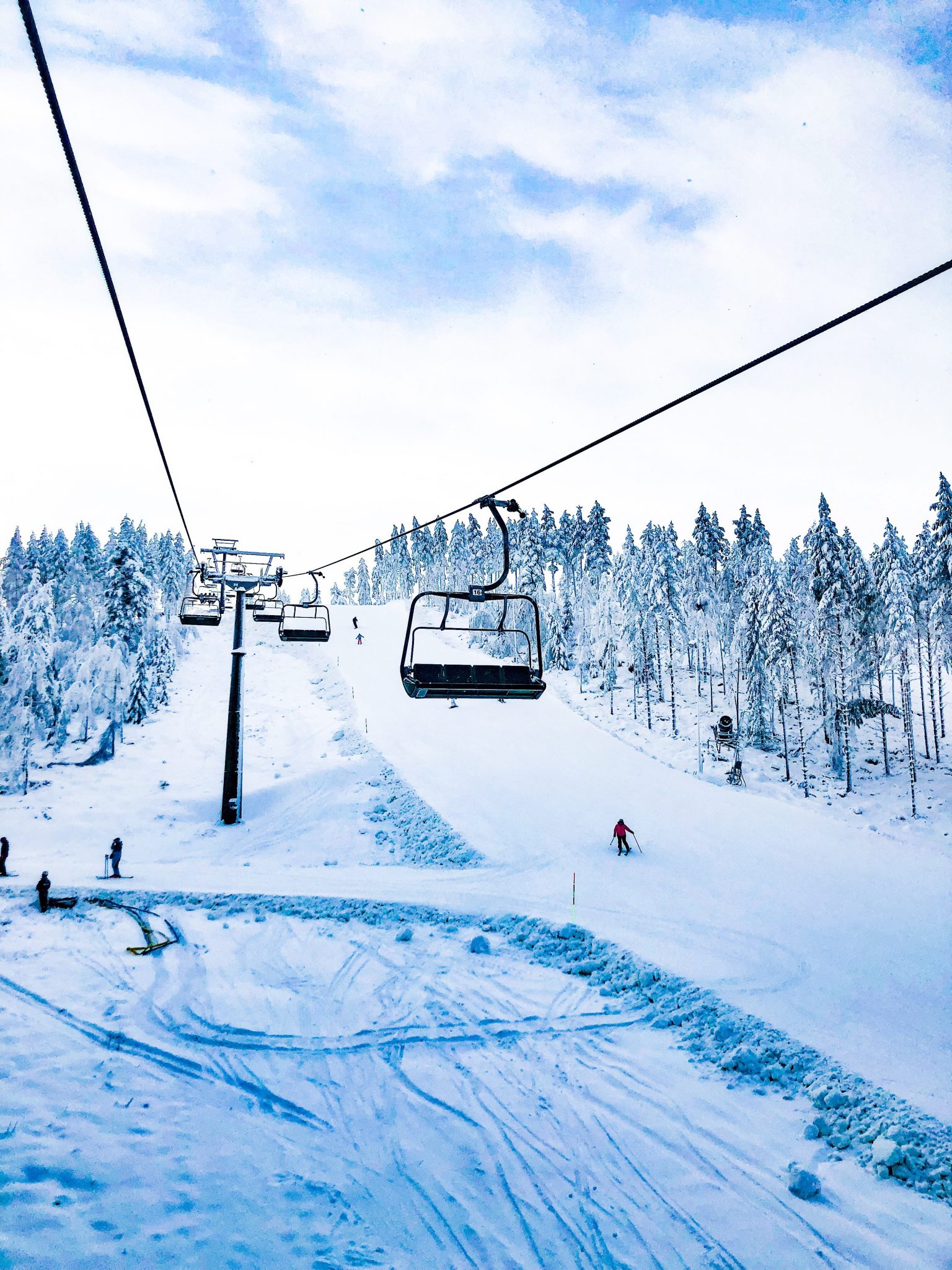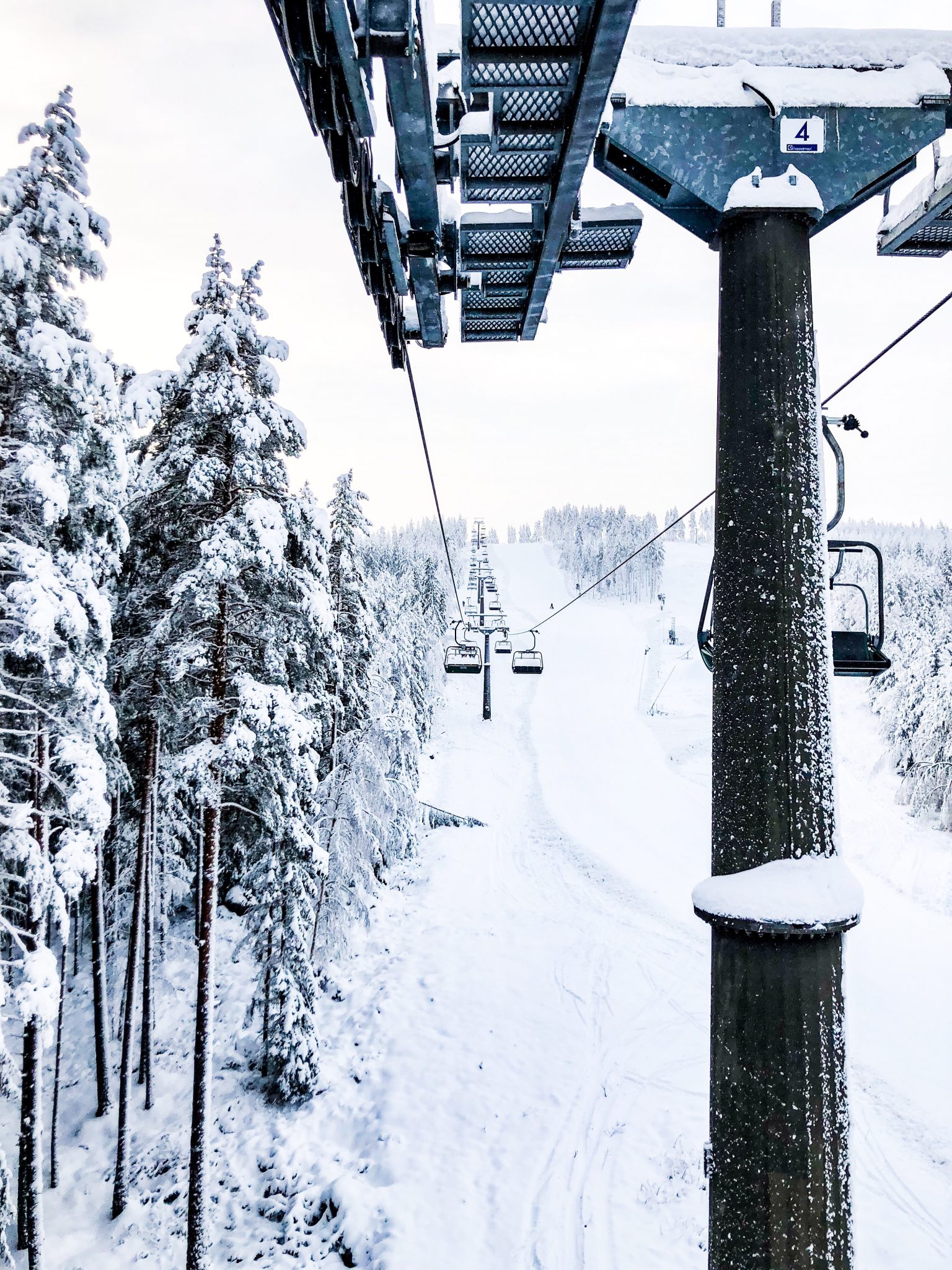 Peppat gäng på väg upp i liften! Det är verkligen magiskt vackert här. Så mycket snö och vinterskrud.