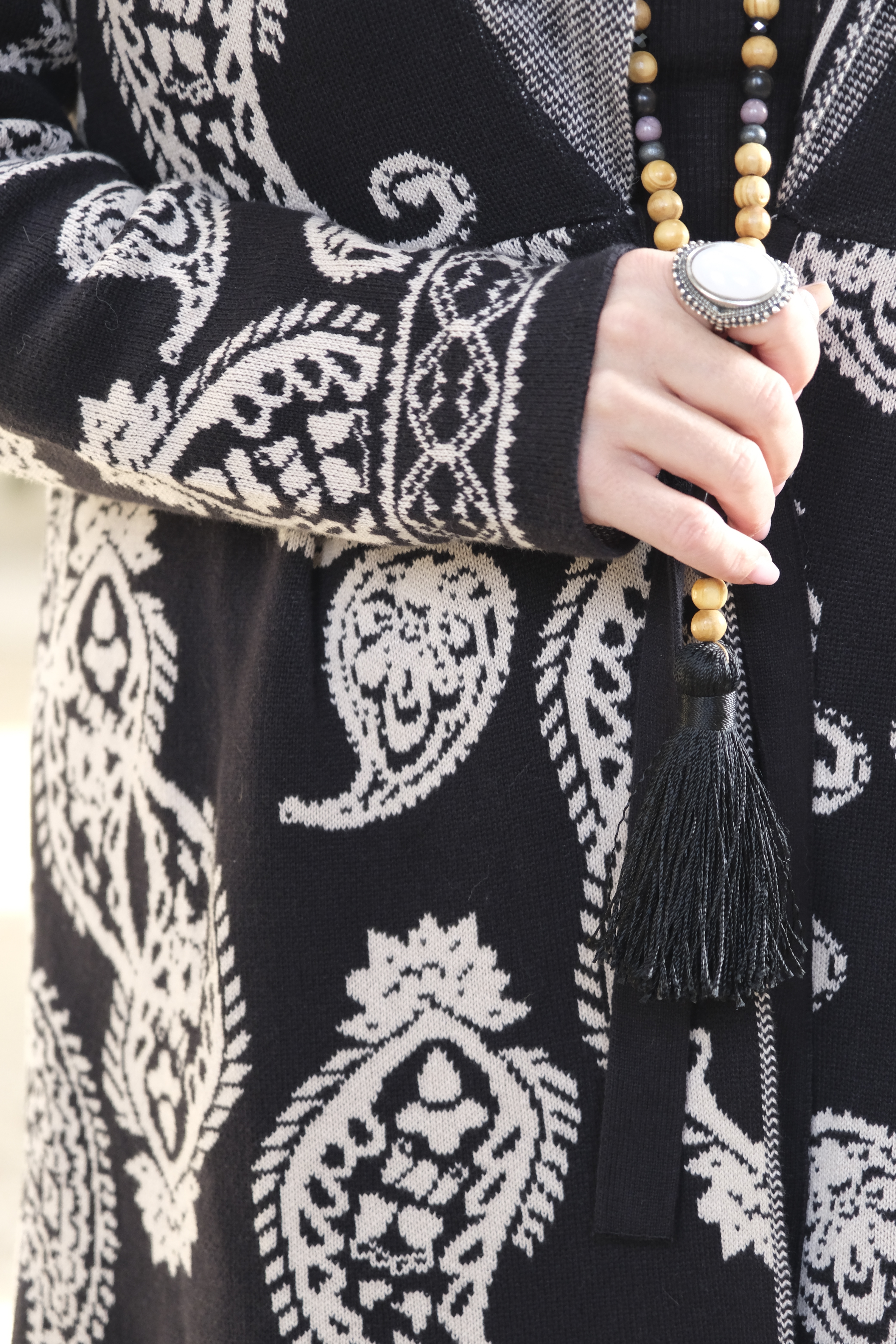 Alltså wooooow woooow wooooow! Som jag föll pladask för denna ”kostym”. Allt i skönt stickat material. Och så detaljerna och printet!!! Koftan är som en riktigt snygg kavaj, har du ett spetslinne eller en snygg blus under kan du gå på en riktigt fin middag eller fest i den. Nej men sååå snyggt. Byxorna, sköna som mysbyxor och så underbart snygga och coola! Skön resår i midjan så de klämmer absolut ingenstans. Gud vad jag kommer använda detta alltså.