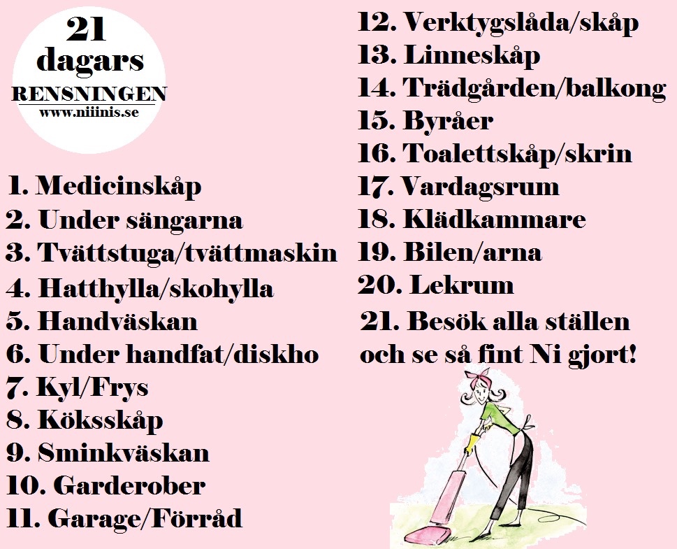 4. Inspirerad! Ska försöka följa listan men vet redan nu att vissa rum/utrymmen kommer att ta längre tid än en dag. Jobbar på dagarna så tar de enklare rensningarna på kvällarna efter jobbet. Tack och lov så städade jag garaget för någon vecka sedan! Tog en vecka och då gjordes ett antal resor till tippen. Men nu …. jäklar vad fint det kommer bli