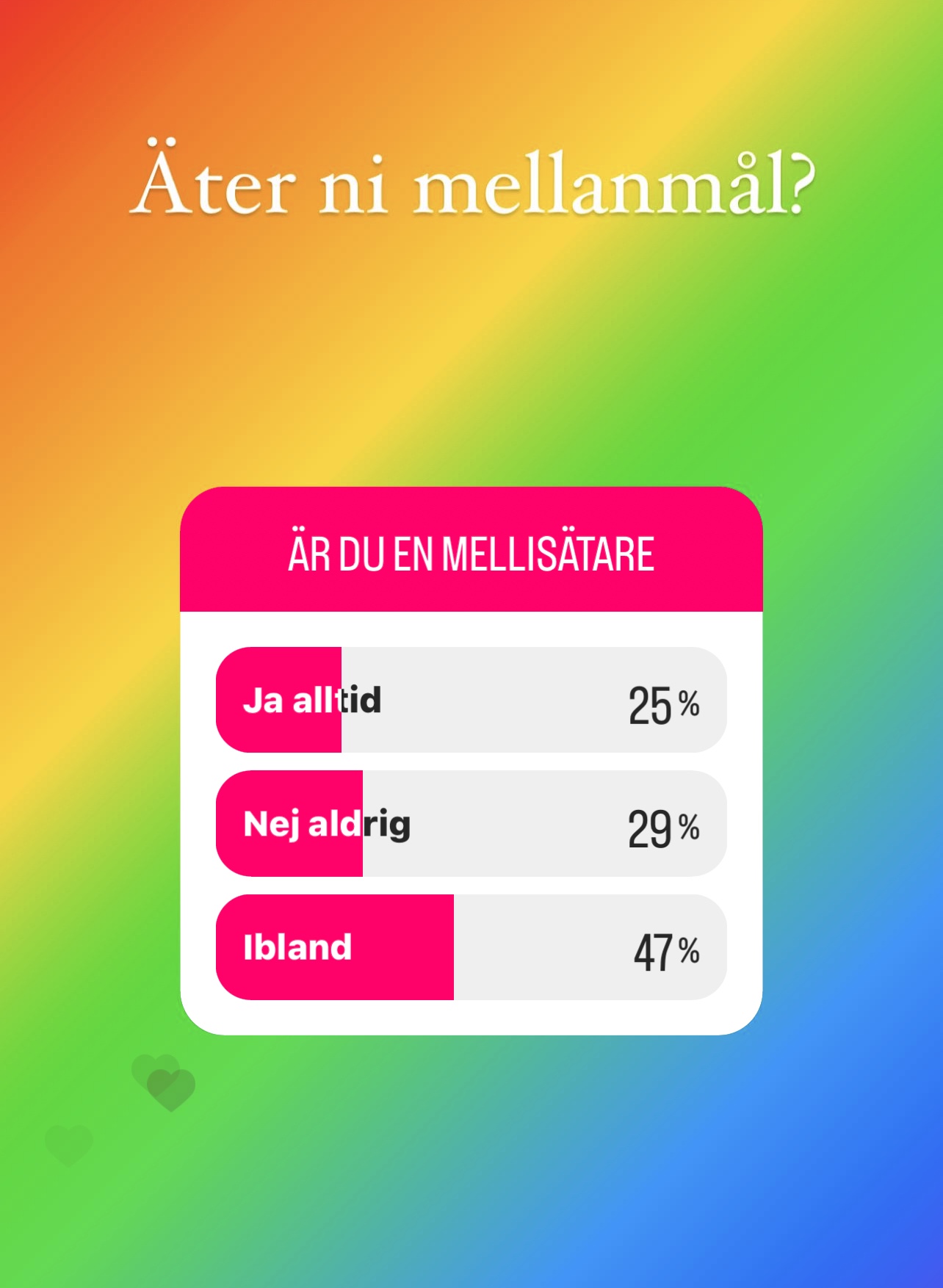 Här är det full fart denna Onsdag. Det är Lill-Lördag och jag försöker alltid planera något lite roligare till just denna dag. Kanske något extra gott till middag, kanske duka lite finare, eller så festar man till det med lite extra goda mellanmål om man inte hinner något annat. Jag frågade nämligen hur många av mina följare som åt mellis eller mellanmål som det heter. Såhär såg svaren ut: