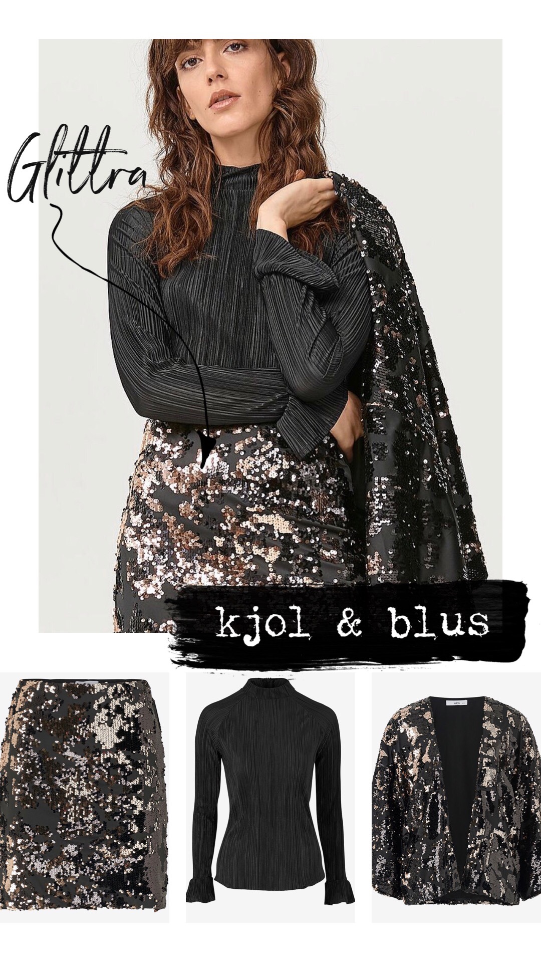 OUTFIT 1) Glitterkjol // Plisserad blus // Glitterkimono