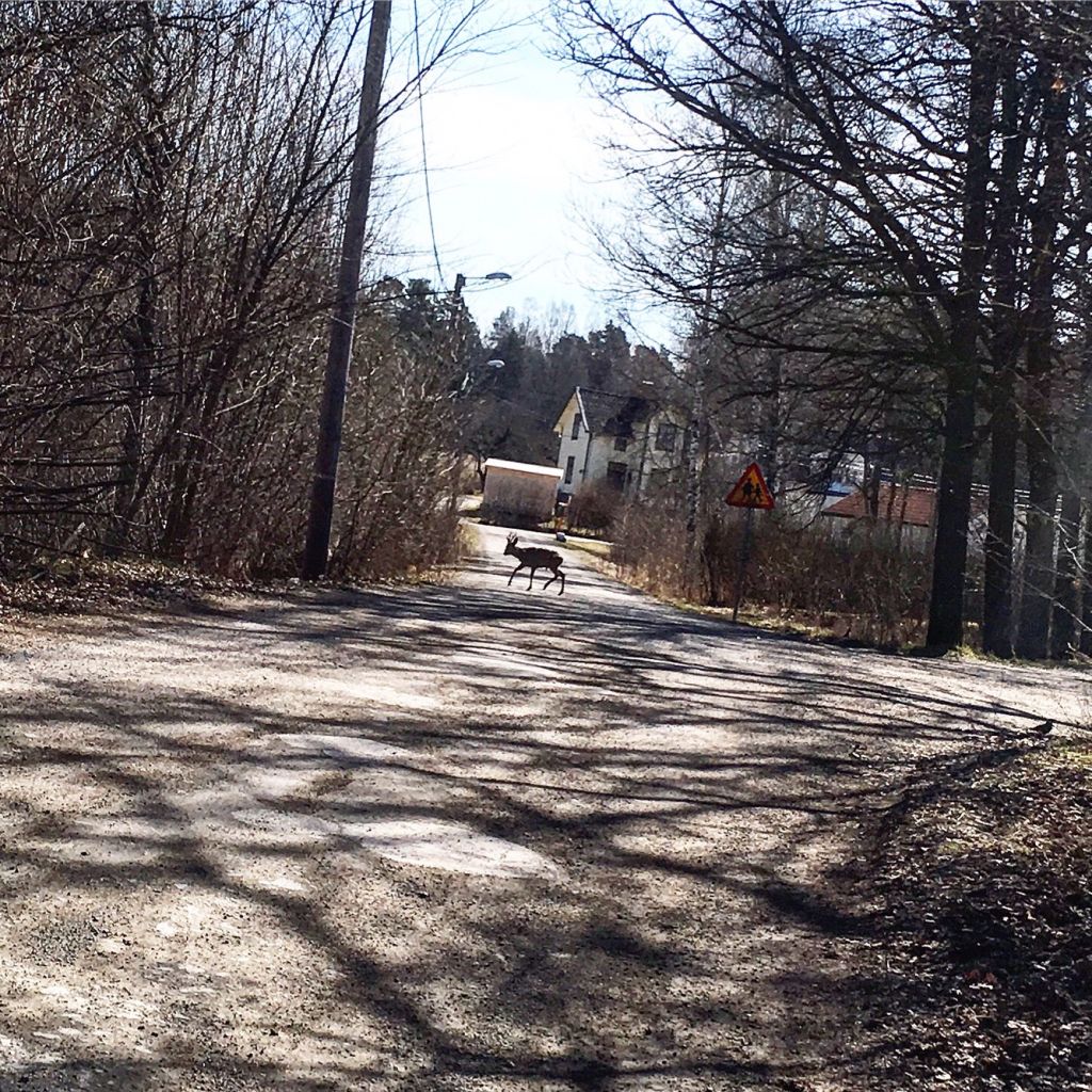 Efter yogan tog jag en promenad hem. Titta så fint när den här lille rådjursbocken gick över vägen precis när jag kom gåendes. Det är något visst med rådjur. Jag blir liksom glad i magen av dem. Jag vet att de är ena jäkla tjuvar och äter upp folks blommor, bär och frukt. Men vi har bara blivit av med lite jordgubbar så jag älskar dom fortfarande. 😉