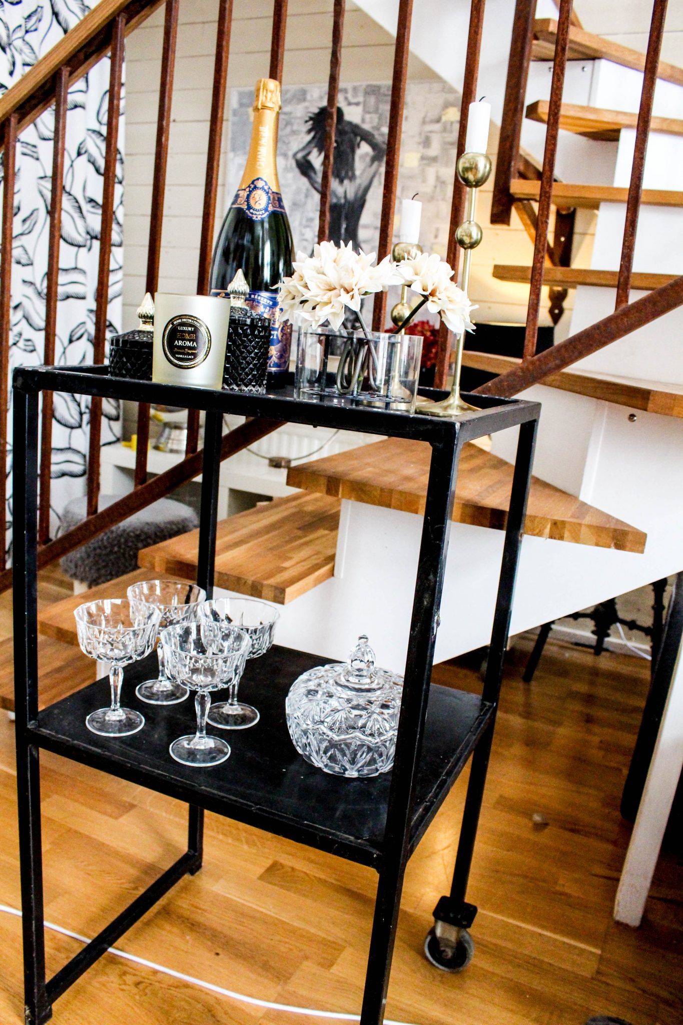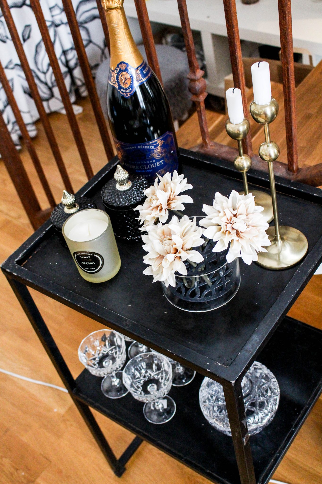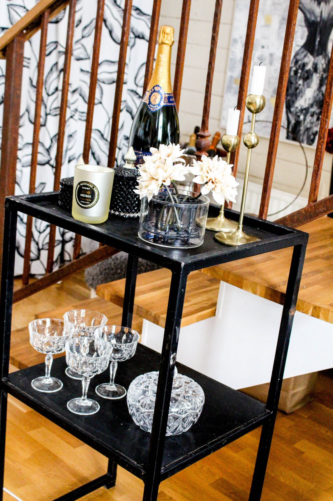 Högst upp på drinkbordet har jag ställt skumpa, sen har jag fyndat små svarta skålar med lock och ett doftljus på Dollarstore. Där står också min >>Ängvas från Klong<< och så är det guldljusstakar från H&M Home.