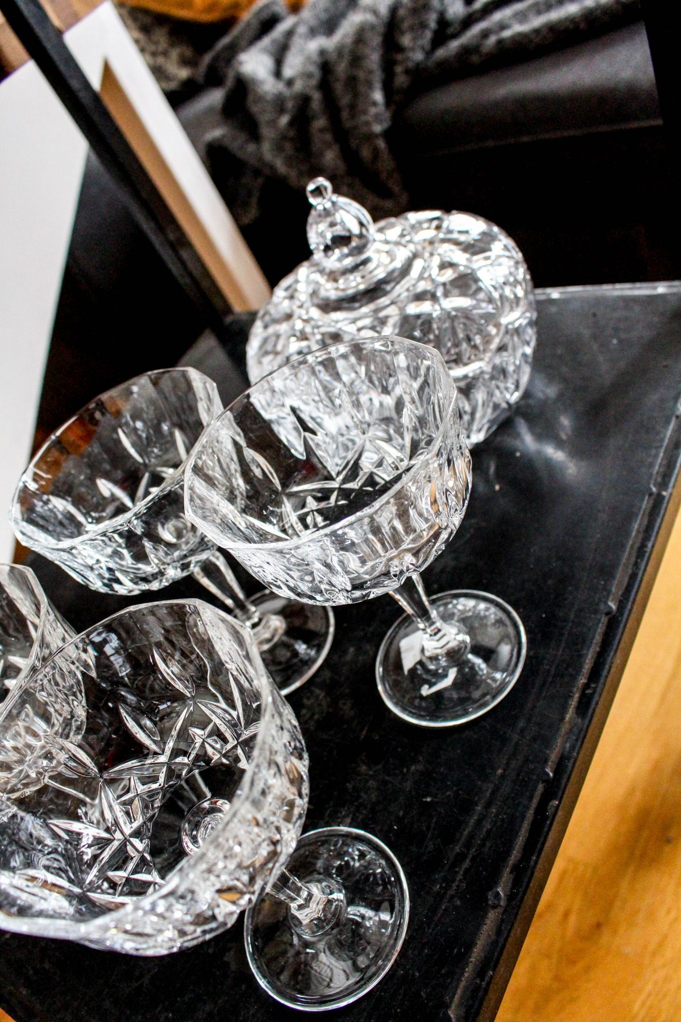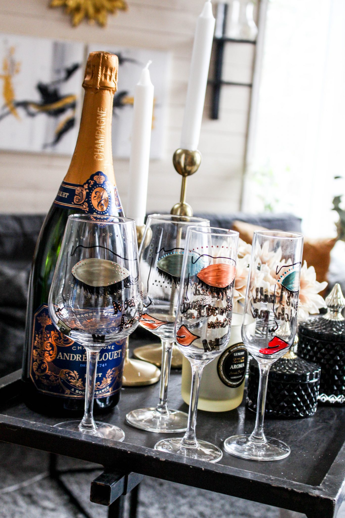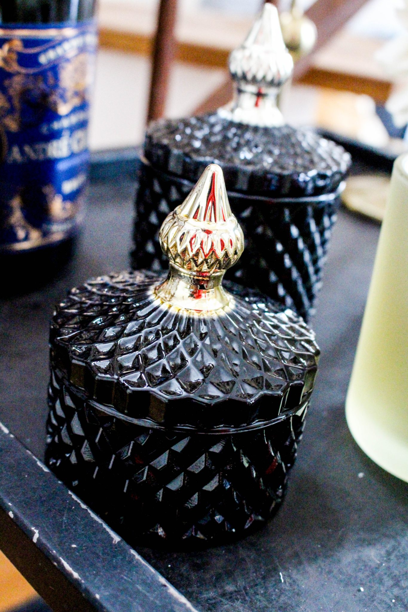 Högst upp på drinkbordet har jag ställt skumpa, sen har jag fyndat små svarta skålar med lock och ett doftljus på Dollarstore. Där står också min >>Ängvas från Klong<< och så är det guldljusstakar från H&M Home.
