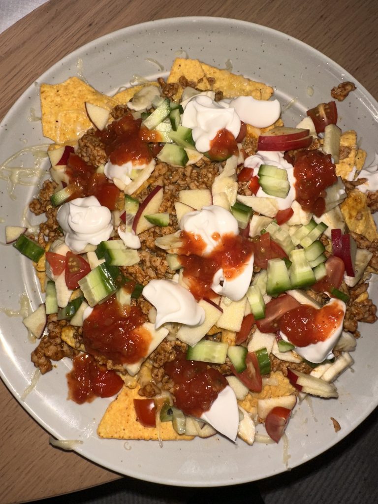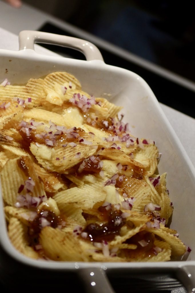 Gjorde också denna goding! Den måste du testa! Det är vitlökschips med brynt smör (har du inte testat chipsen än – gör det!) i botten, sedan är det skivade brieostbitar, plommonmarmelad (galet god marmelad som du bara måste ha hemma), och finhackad rödlök uppepå. Så gott!