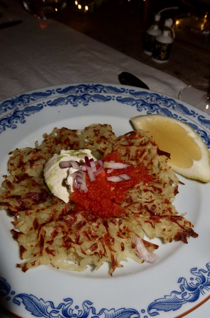 Råraka som tillagats i våffeljärnet med smetana, stenbitsrom, citron och hackad rödlök till förrätt. Så gott! Också superfrasigt av att göra den i våffeljärnet.