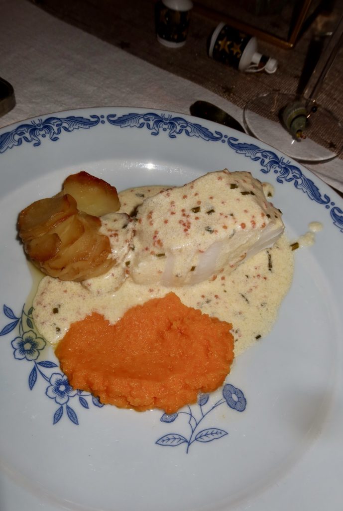 Till varmrätt blev det torskrygg med potatiskaka, morotspuré och sandefjordssås. Väldigt gott!