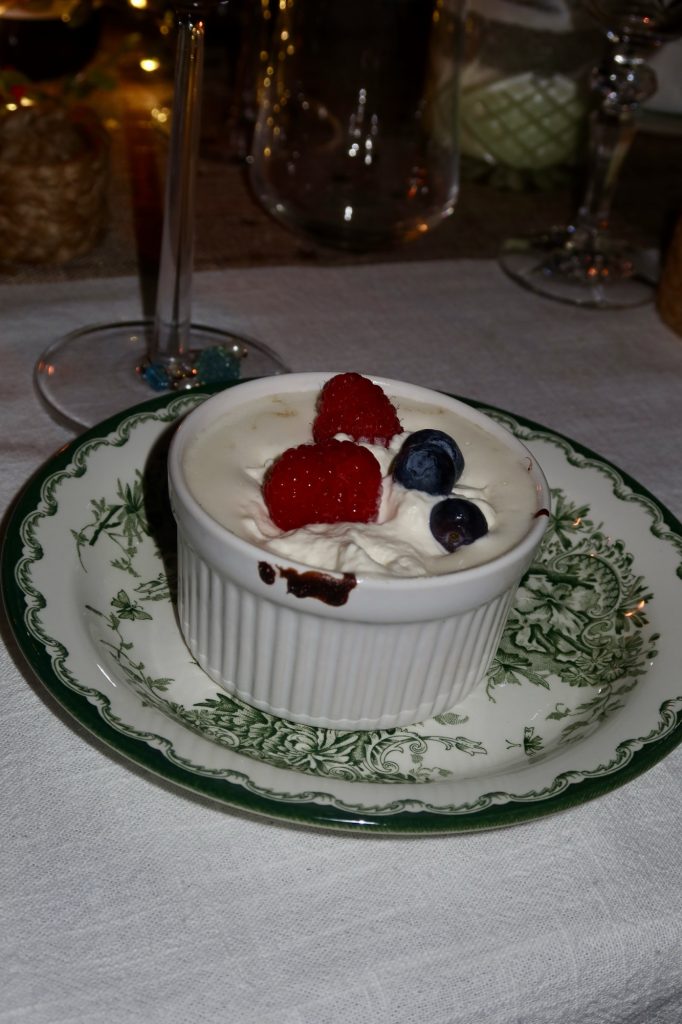 Sedan blev det chokladfondant och vispad grädde med bär till efterrätt. Middagen signerad Mange & Maria.