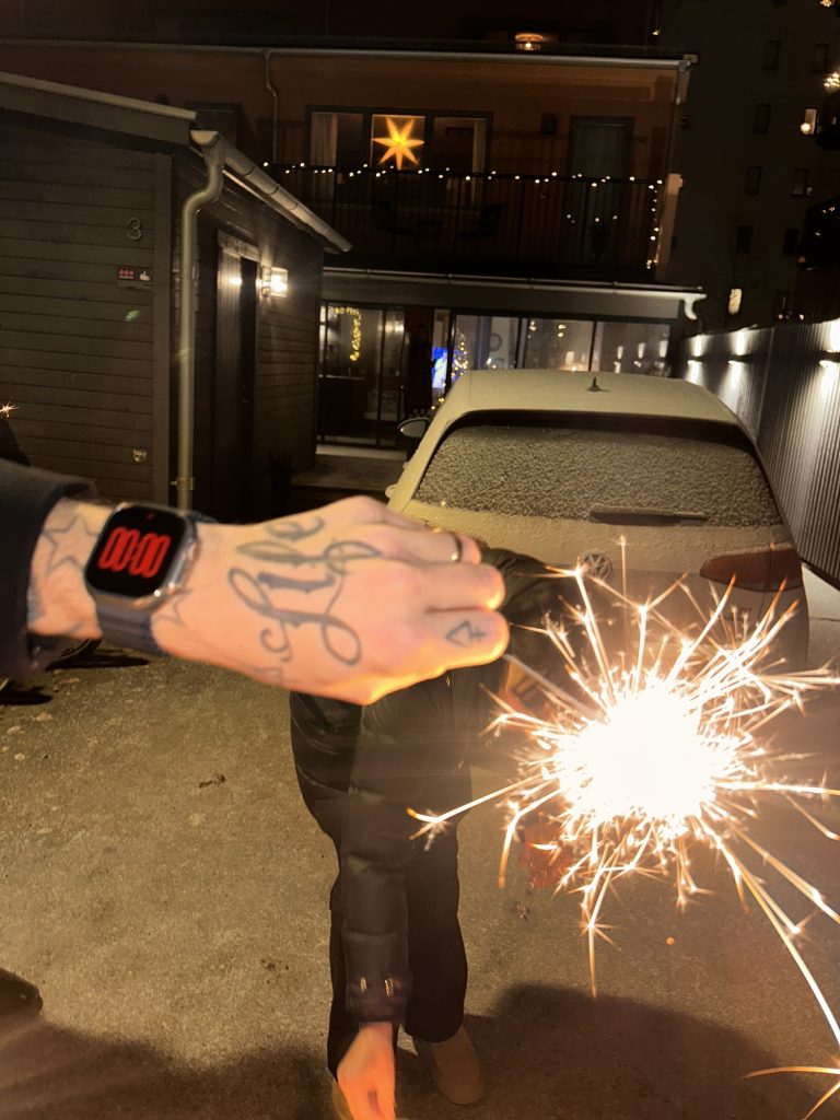 Efter middagen som vi tajmade perfekt för 12 slaget, gick vi ut och kikade på raketerna och skålade i Amore Bianca alkoholfri. Riktigt god, så tips tips! Vi körde tomtebloss medan raketerna for över våra huvuden. Så glad att Elliot var med oss på 12 slaget. ❤️