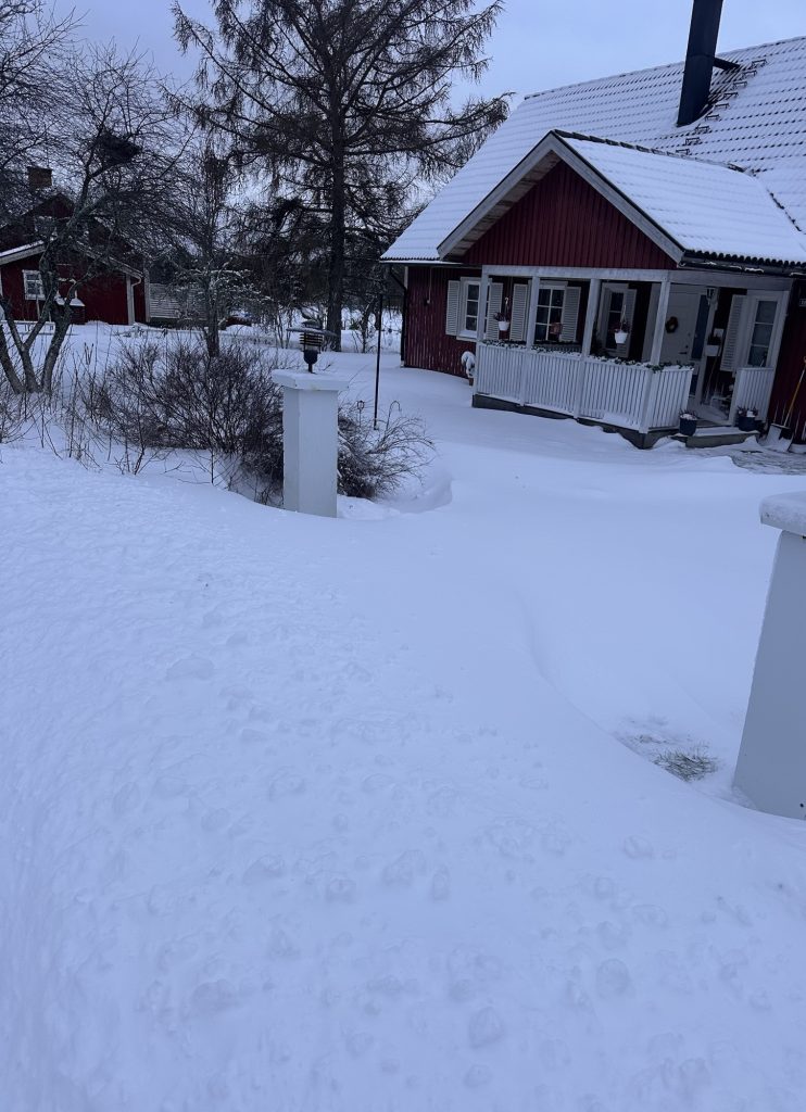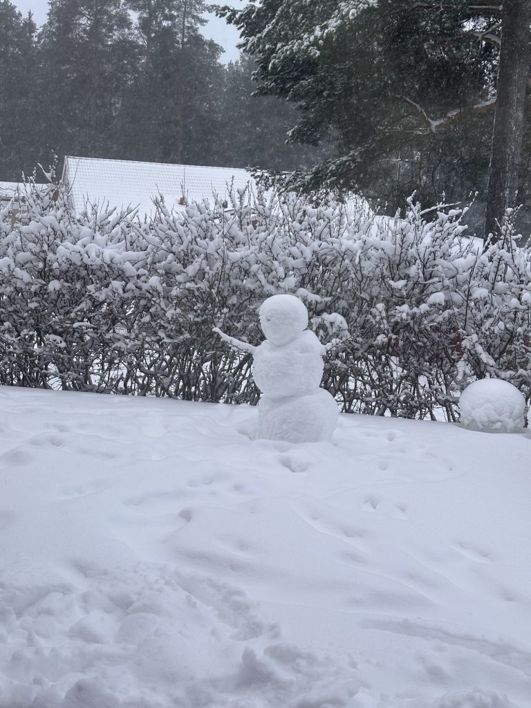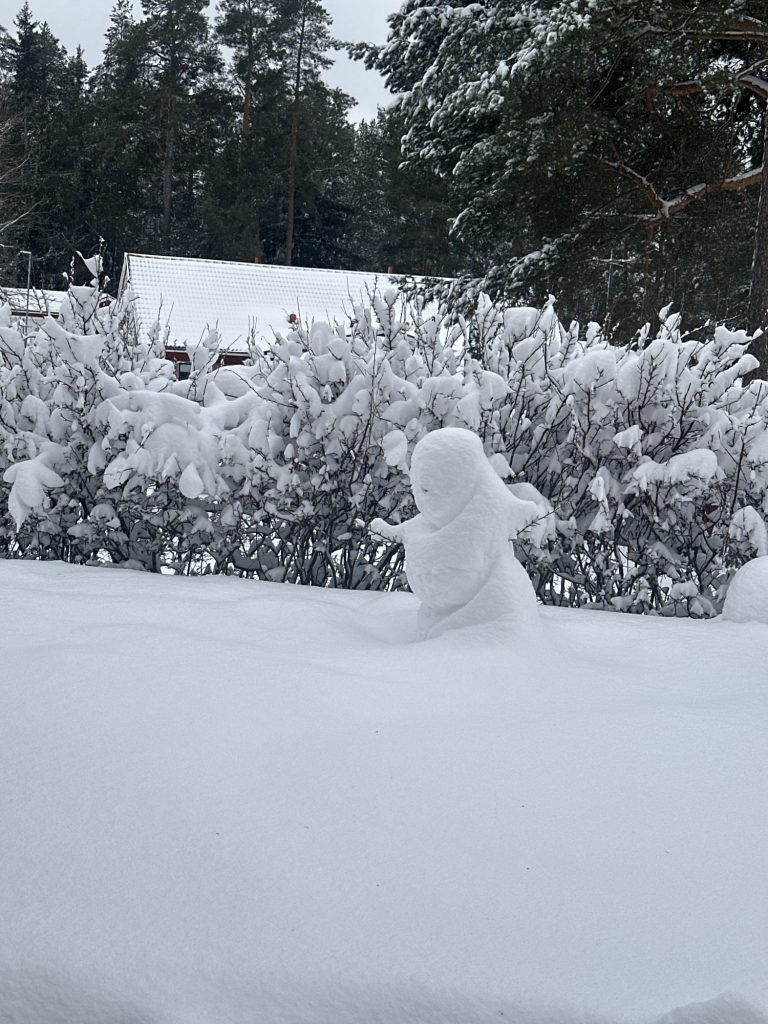 På ett dygn fick snögubben en tjock fluffig jacka på sig. Haha….. det slutade äntligen igår och ska väl vara lite lugnare nu. Så kanske vågar vi oss ut på den stora vägarna idag? Vi får se?