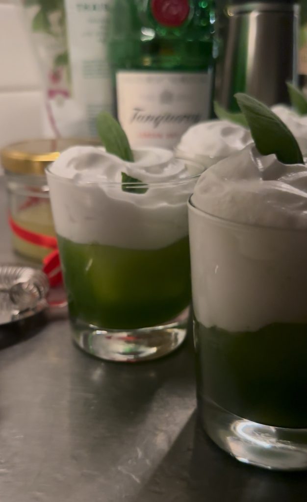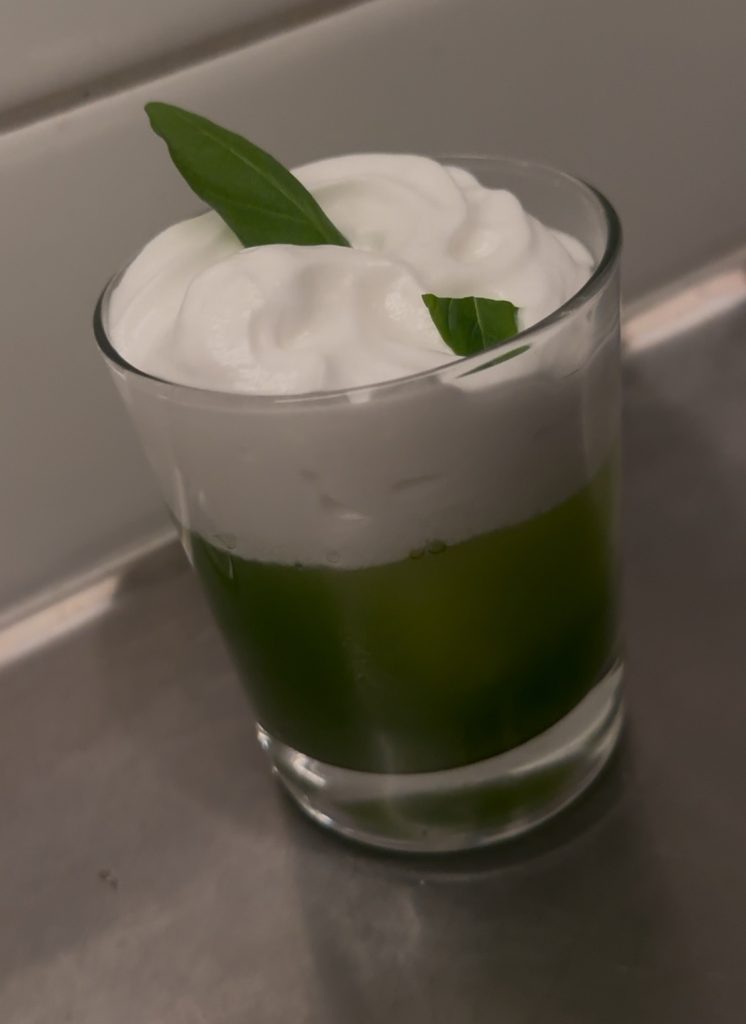 4) Toppa med kokosskum. Garnera med thaibasilika.