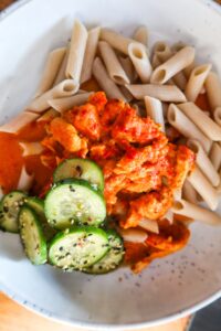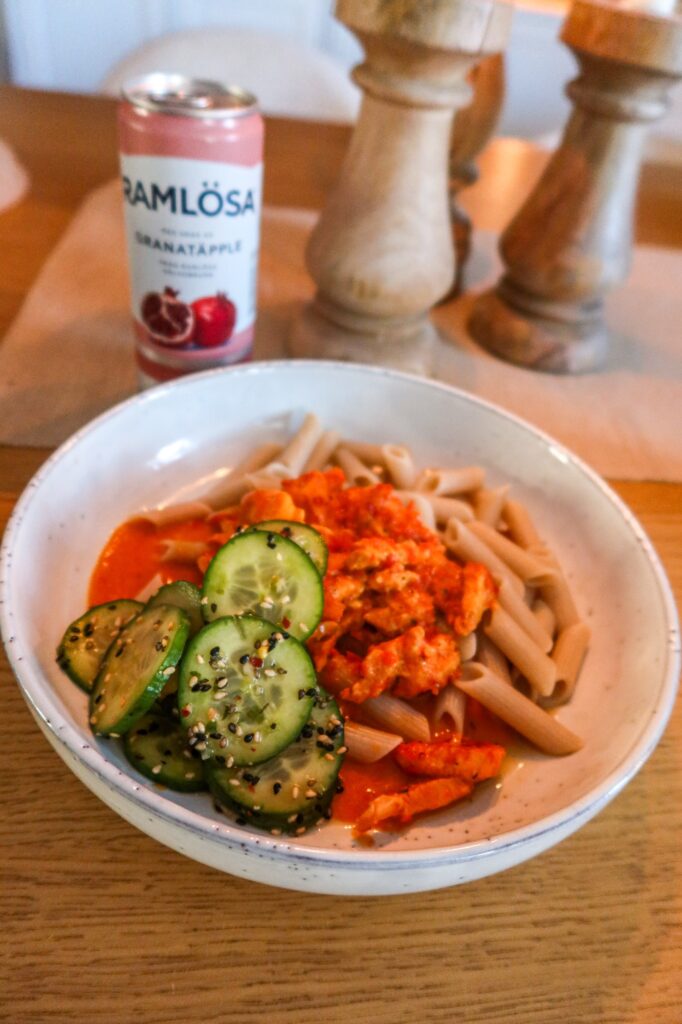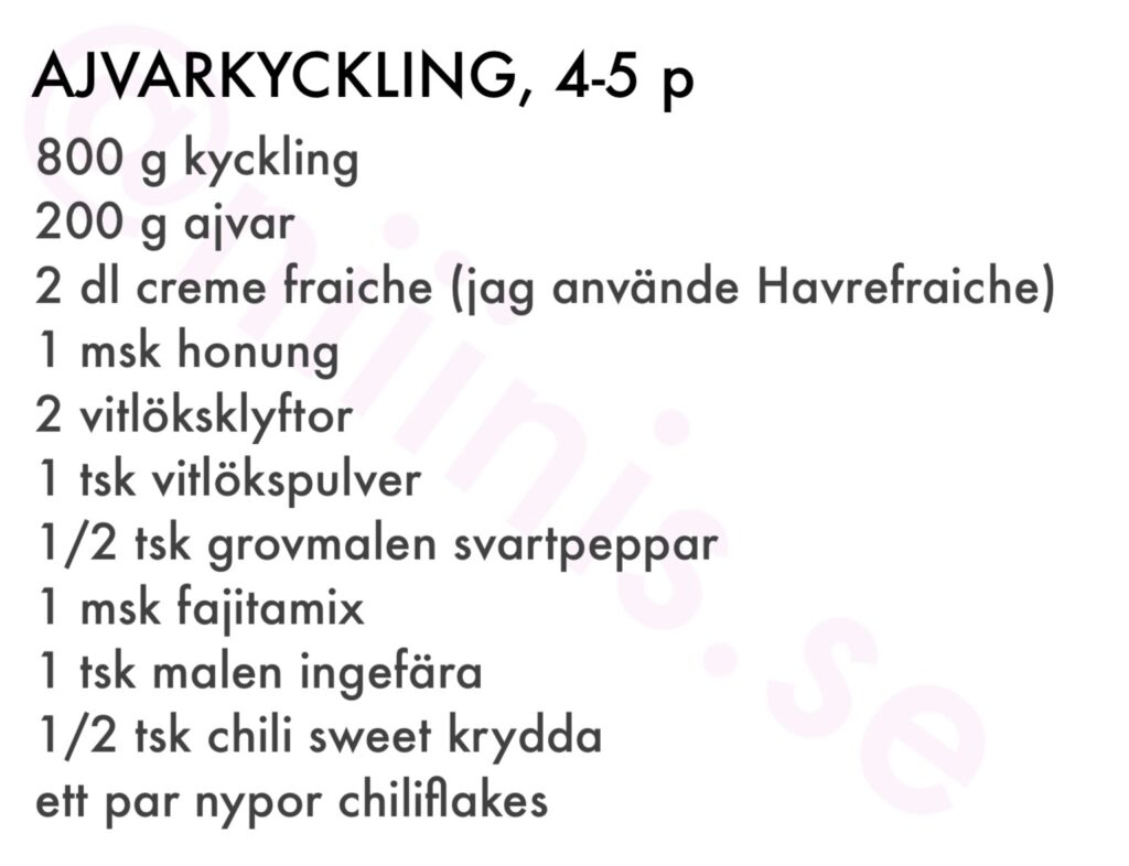Igår lagade jag en riktigt god rätt med ajvarkyckling, den här är nästan löjligt enkel att laga och sköter sig själv i ugnen. Ajvarkyckling kan man bestämma ”styrka” på själv. Det finns ju starkare ajvar, jag använde den som är mild. Till vår Ajvarkyckling gjorde jag en gurksallad som blev så himla god. Så fräsch och jag kan säga att det blev inte en enda gurkbit kvar.