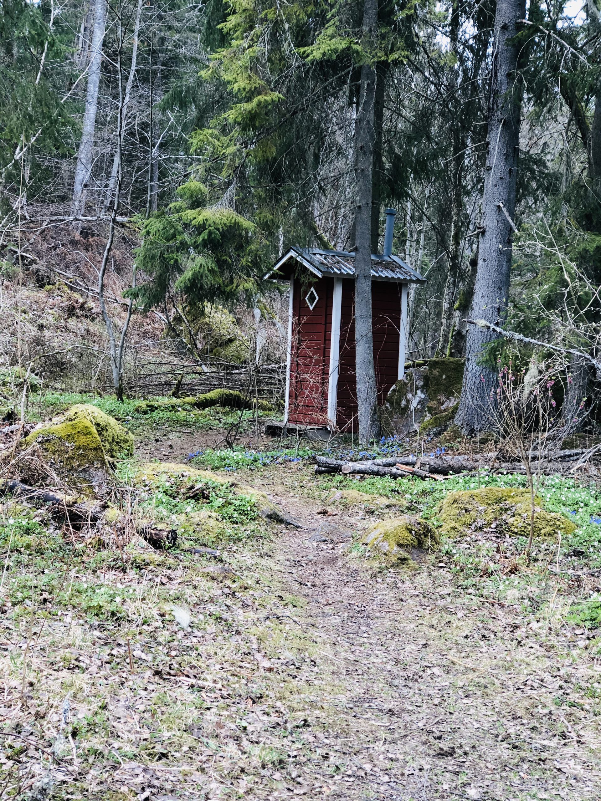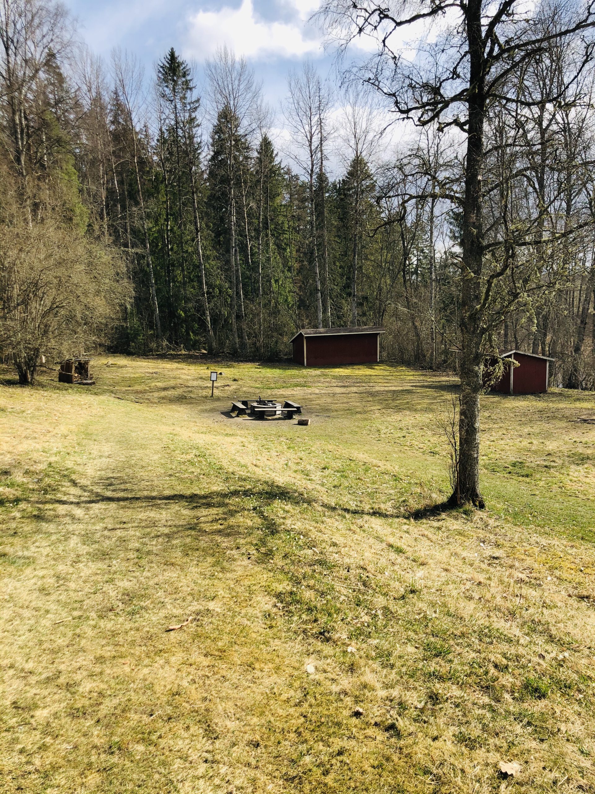 Vi satte oss vid den här eldstaden och fikade. Min nybakta äppelkaka var med, sen kokade vi med oss te och varm choklad. Fanns t.o.m en liten toa i anknytning till grillplatsen.