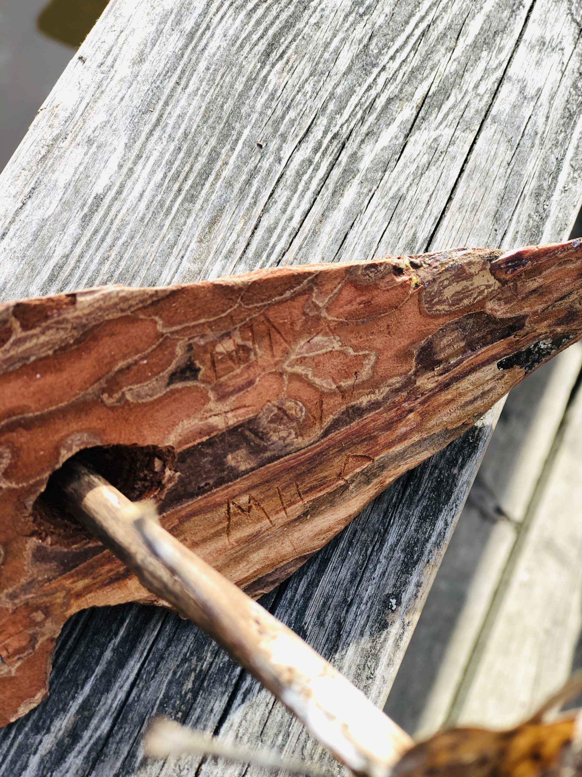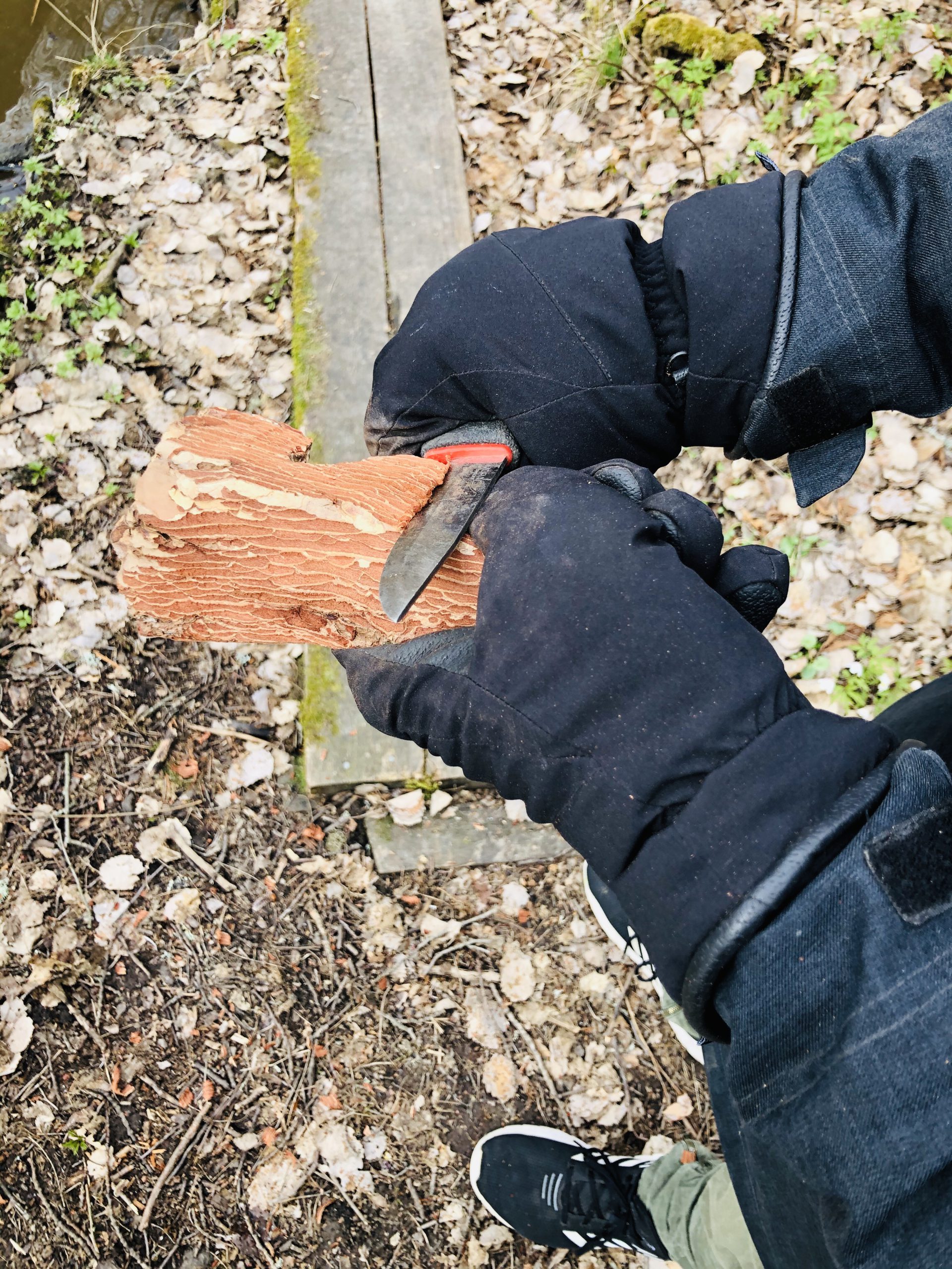 Tony började tälja en barkbåt och vi utforskade bron jag och Milo. Vem täljer ens en barkbåt sådär rakt upp och ned? Jo men min Tony gör det. Blev ju helt kär att han tagit med sig täljkniven och kunde ta upp den som värsta McGuyver och tälja till en barkbåt bara sådär. Haha….. ❤️
