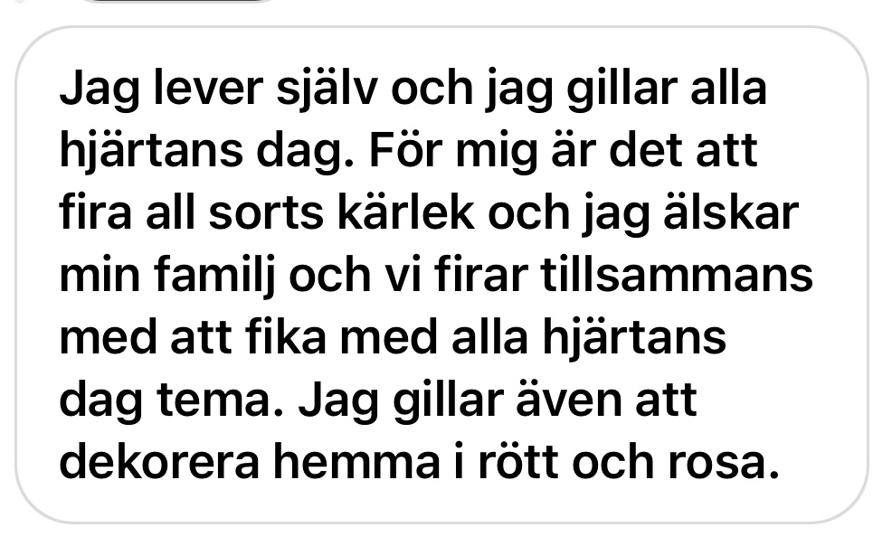 Jag blev så glad, och det kändes som att det du skrev om Alla hjärtans dag, dina åsikter, var så positivt tänkande! Hur man kan göra dagen till något fint. Och att vi som lever kan fira. Och att det inte behöver innebära att man slår på stort. Så gulligt ju när du skrev kattmatstårta. ☺️