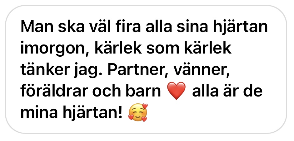 Apropå Alla Hjärtans Dag, det visade sig vara en het potatis märkte jag på min Instagram story igår. Det verkar vara provocerande för en del med Alla Hjärtans Dag. En del tycker att det är trams, hysteri, ett kommersiellt trams som är uppsjåsat till en enda dag när kärleken skulle firas varje dag. En del lider av den dagen då de kanske är singlar, kanske ofrivilliga singlar vad vet jag? En del är ledsna för att de lever med en totalt oromantisk partner som t ex vägrar betala pengar för en middag på stan en sån kväll eller ens har köpt en blomkvast på alla år de varit tillsammans. Detta är alltså dm:s som jag fått från folk på min Instagram som berättat detta.