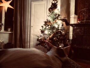 Jag ligger här med kissen på magen och glor på vår julgran. Eller just nu gör jag ju inte det eftersom jag skriver till dig.