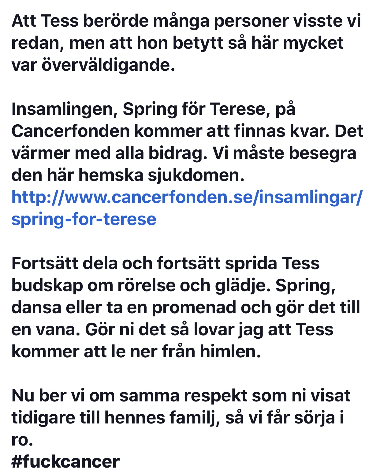 Älskade fina Terese. Tänker på dig och din fina familj. Önskar styrka och sänder alla kärlek jag har till dom i deras svåra stund.