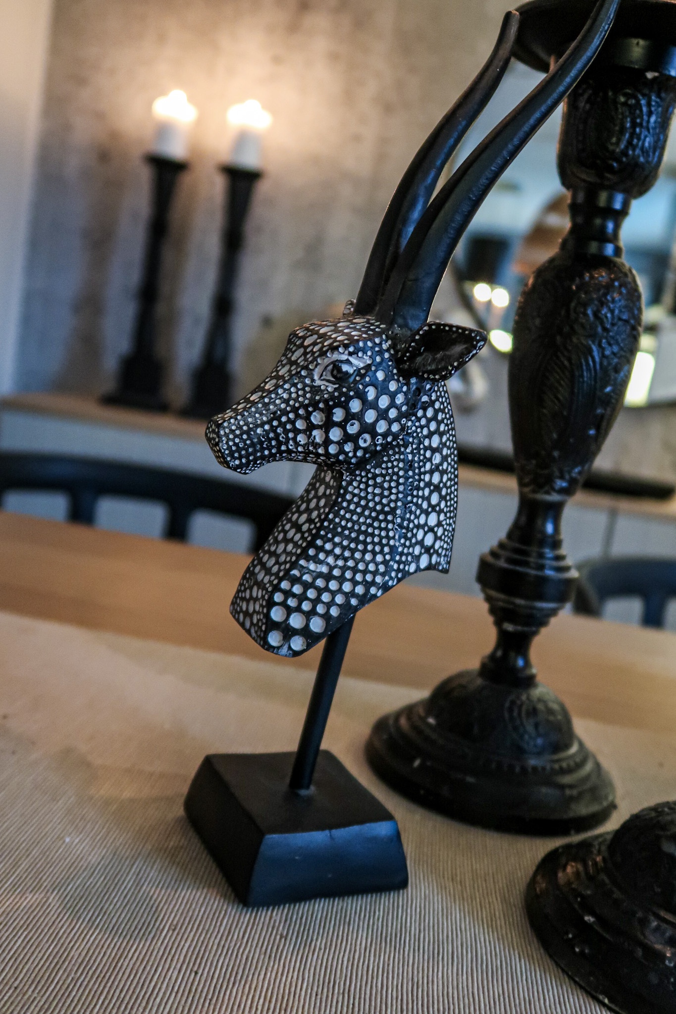 Stort svart träfat // Elefant (jag har den stora) // Stora svarta ljusstakar // Lampor matbord // Spegel Rusta // Matbord // 2 st Sideboard (luckor + toppskivor) // Matstolar // Höga lampor på sideboard // Vas på bordet // svarta ljusstakar ommålade gamla // Affisch 1 // Affisch 2