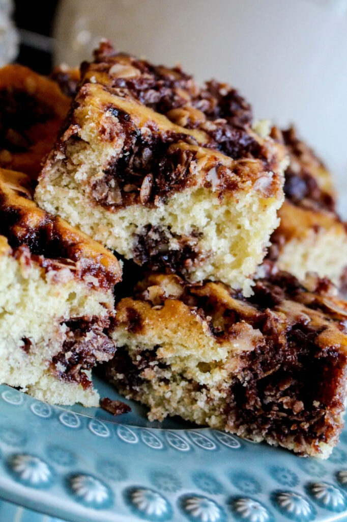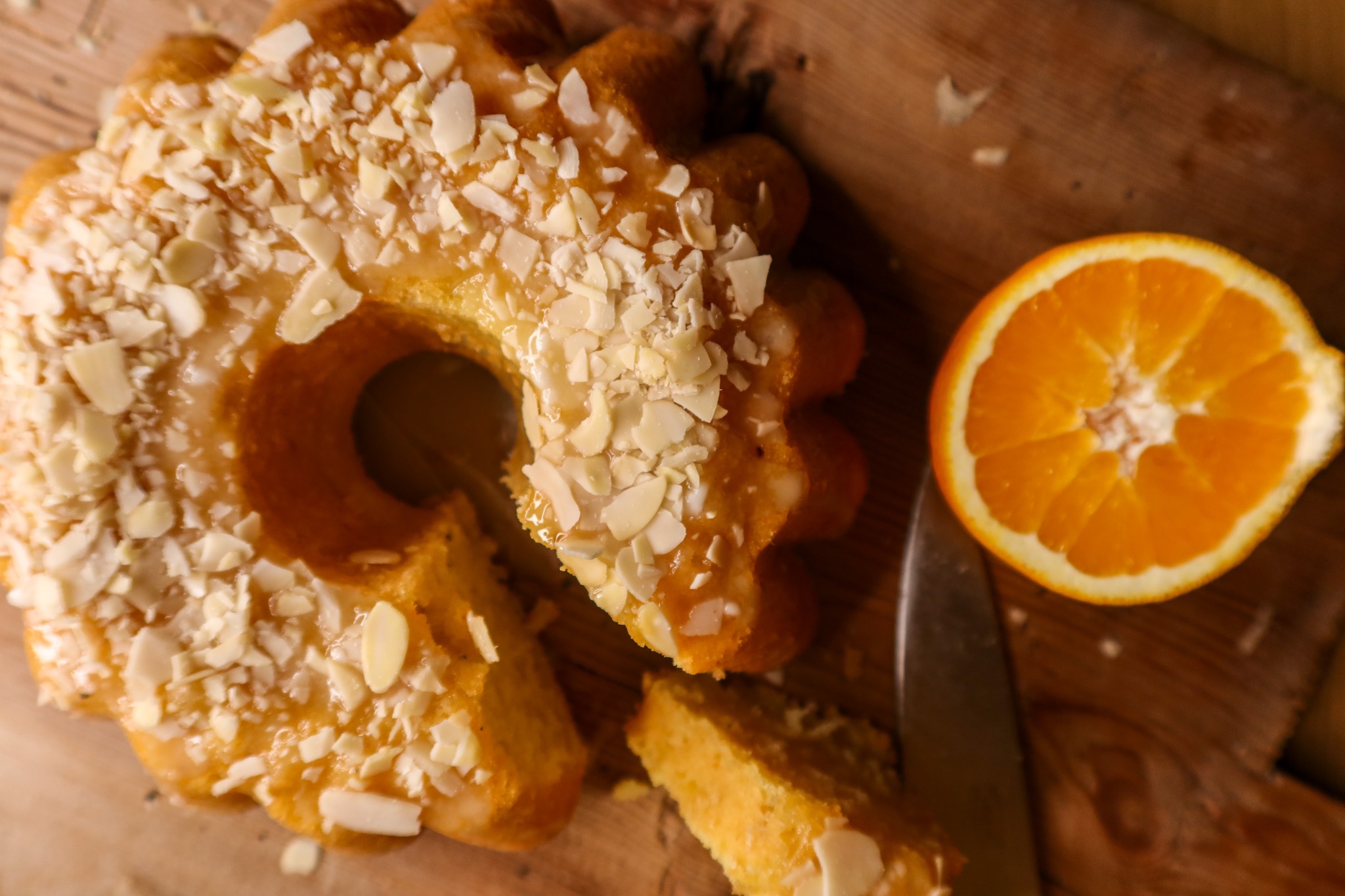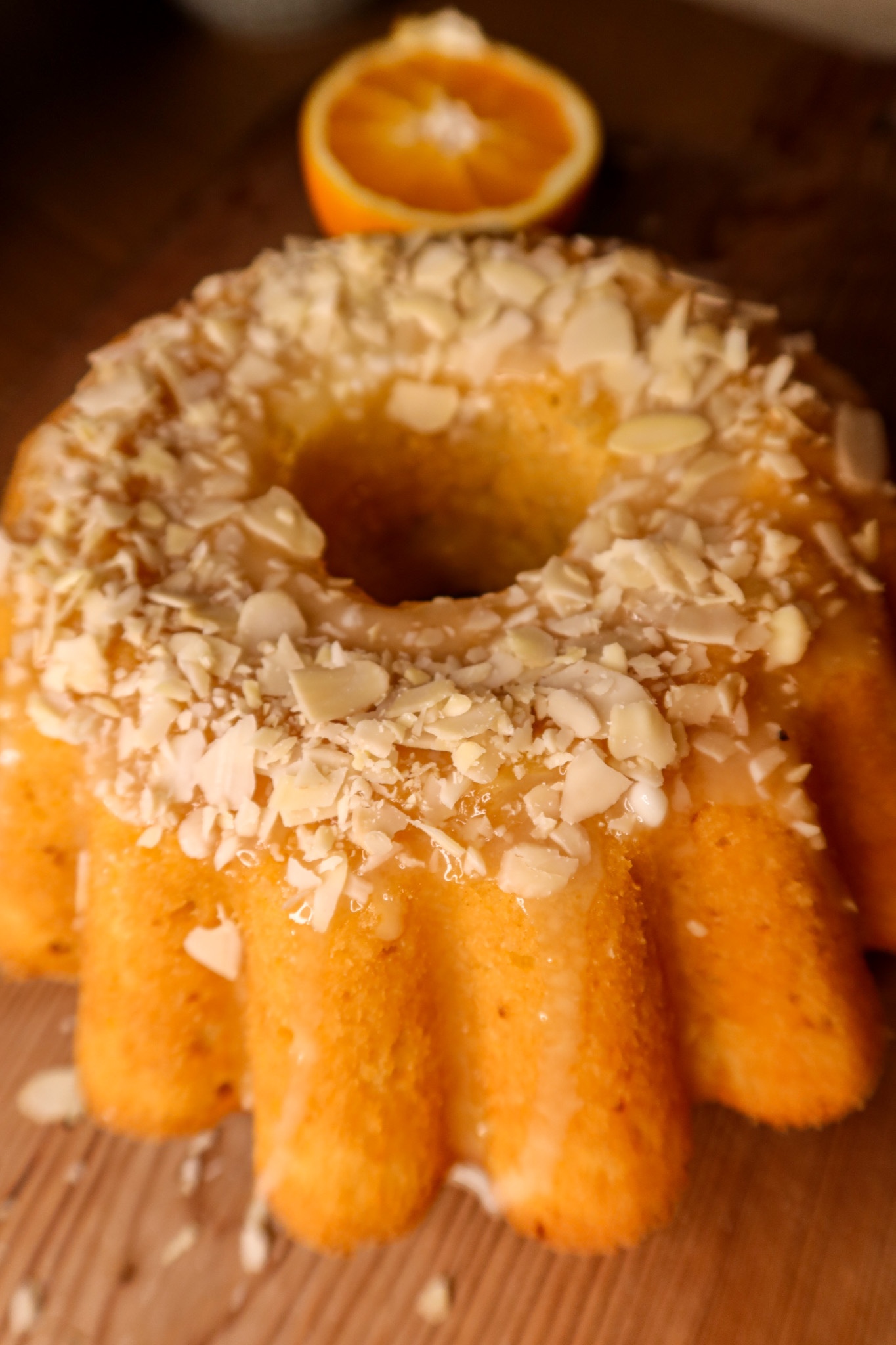 5) Glasyr: Rör ihop alla ingredienser och häll det över sockerkakan. Toppa med flagad mandel.