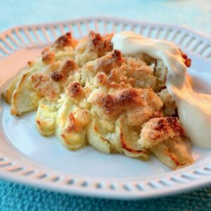 3) Fördela smuldegen jämt över äpplena och grädda mitt i ugnen, 200° i ca 25 min. Servera pajen ljummen tillsammans med kesella. Ät och njuuuut!