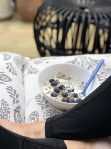 Sitter på baksidan och försöker intala mig själv om att det är varmt och skönt och att det är supermys att sitta här och äta frukost. Haha….