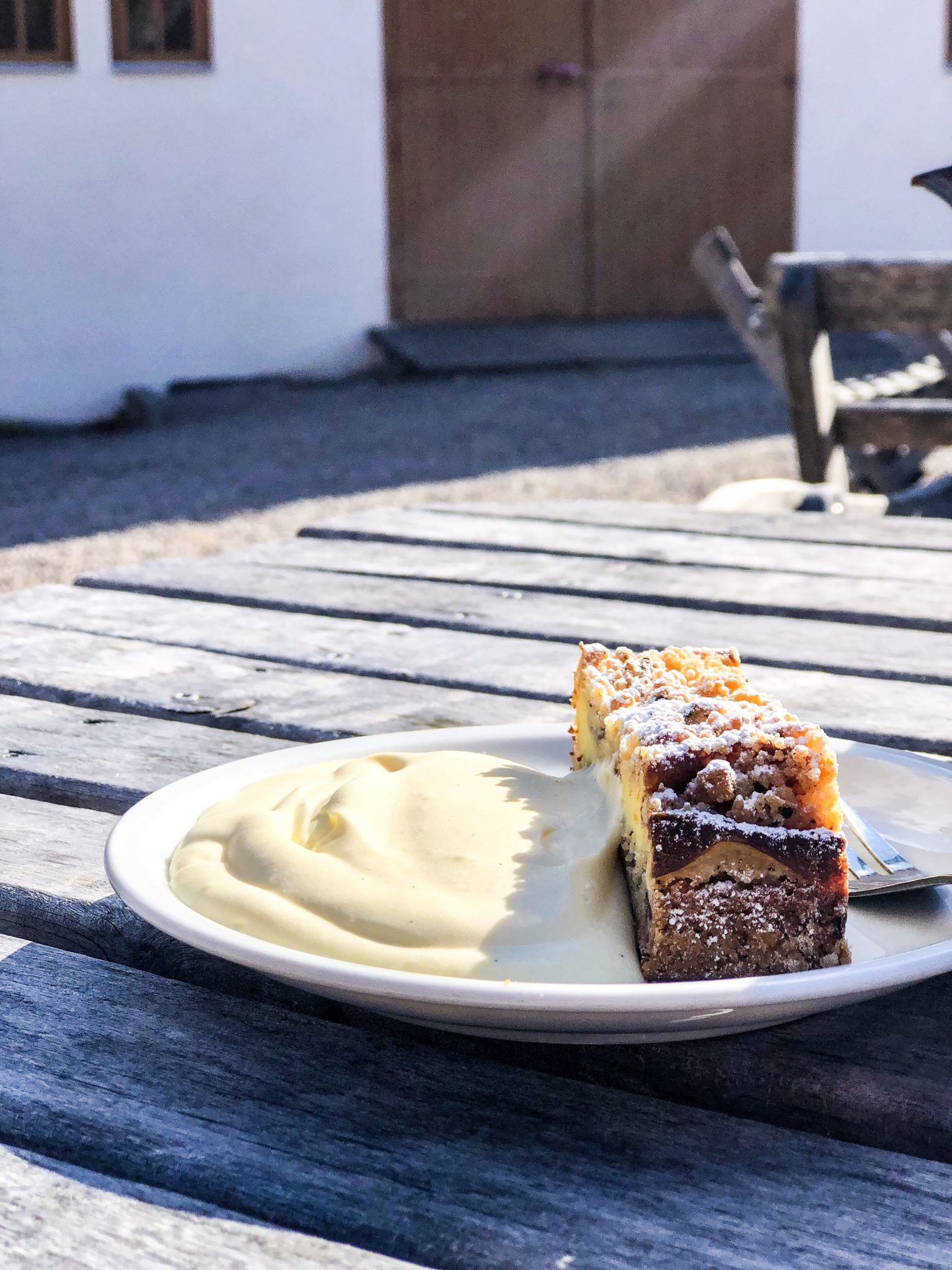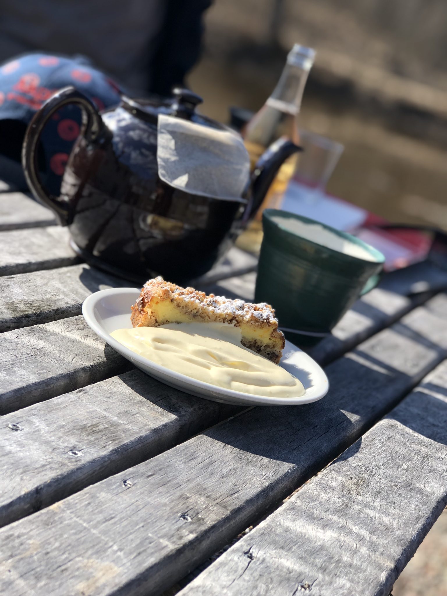 Vi satt precis vid vattnet och njöt. Solen värmde och det blev årets första fika utomhus. Jag åt en magiskt god apelsinruta med vaniljkräm, hummade högljutt alltså. Mördegsbotten med mörk choklad, apelsinkrämsfyllning och en härlig smuldeg uppepå. Jag lovar, den var magiskt god, måste testa baka något liknande.