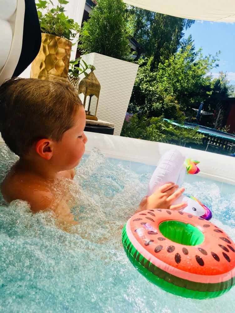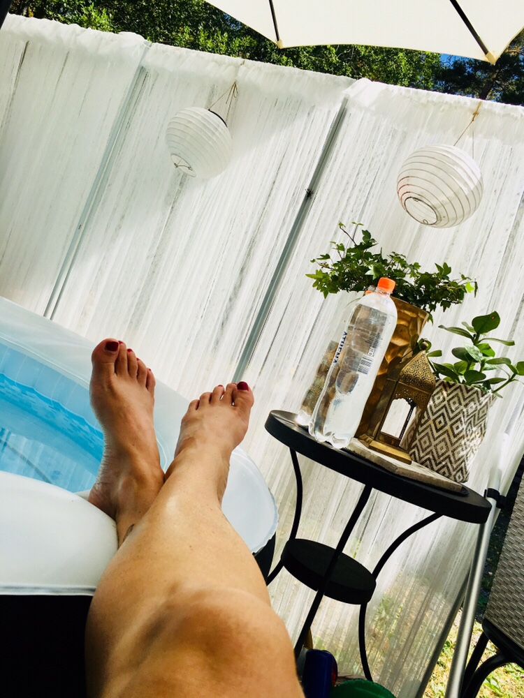 Vi gjorde i ordning baksidan med bubbelpool. Där spenderades många timmar. Både träning och bubbelkopp blev det.