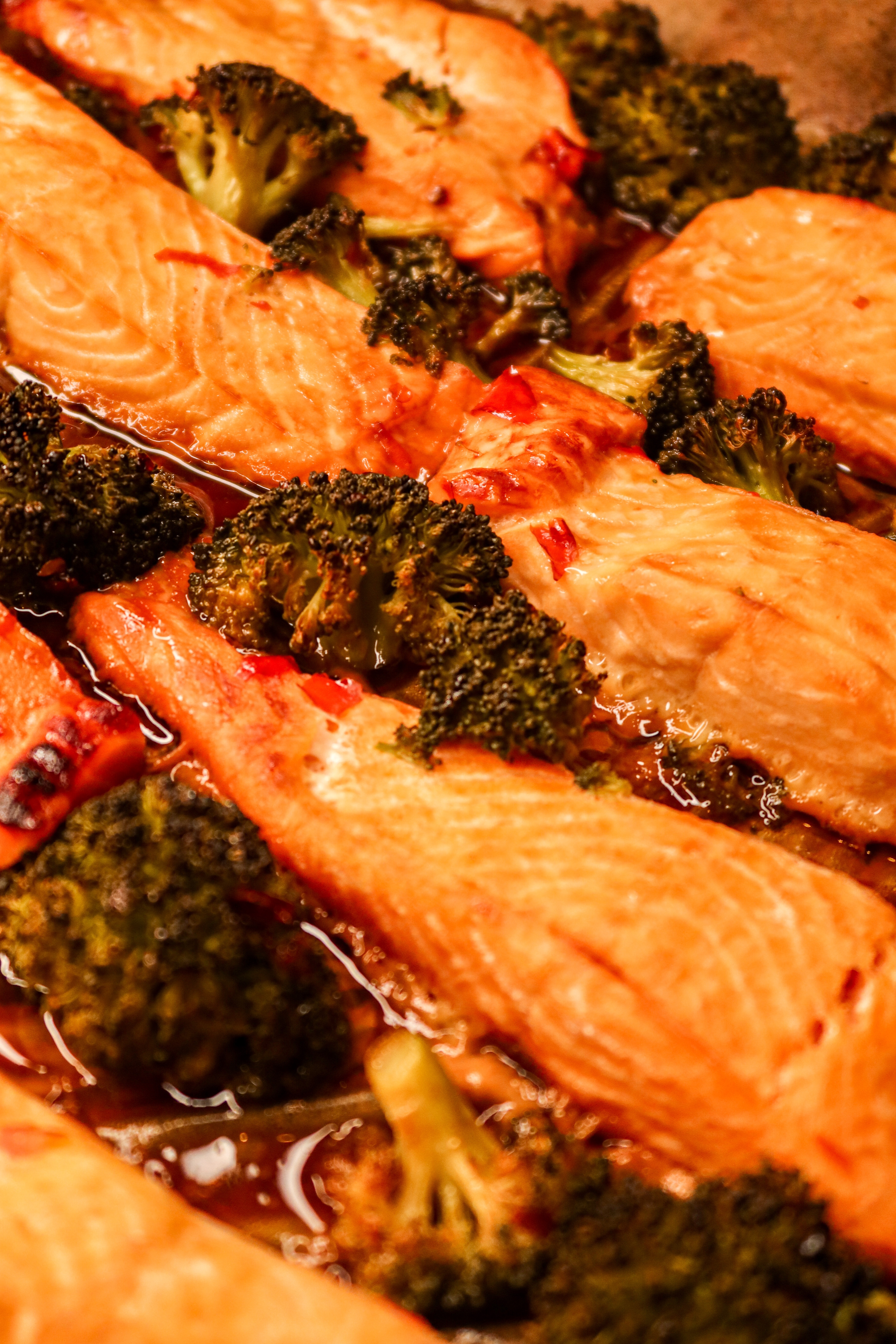 2) Blanda hoisinsås, soja, honung och sweet chili. Pensla på alltihopa på laxfiléerna. Skär loss broccolibuketterna och fördela ut dem mellan laxfiléerna. Pensla även broccolibuketterna.