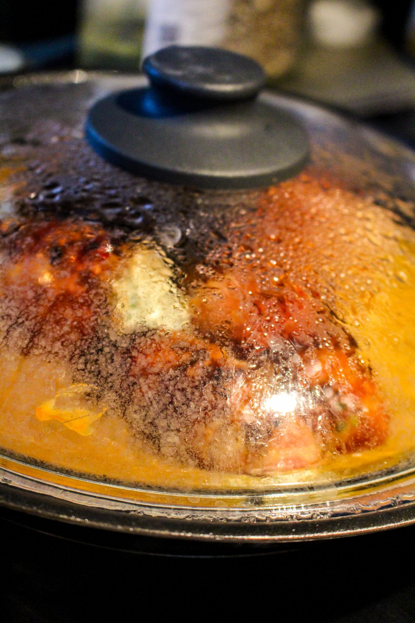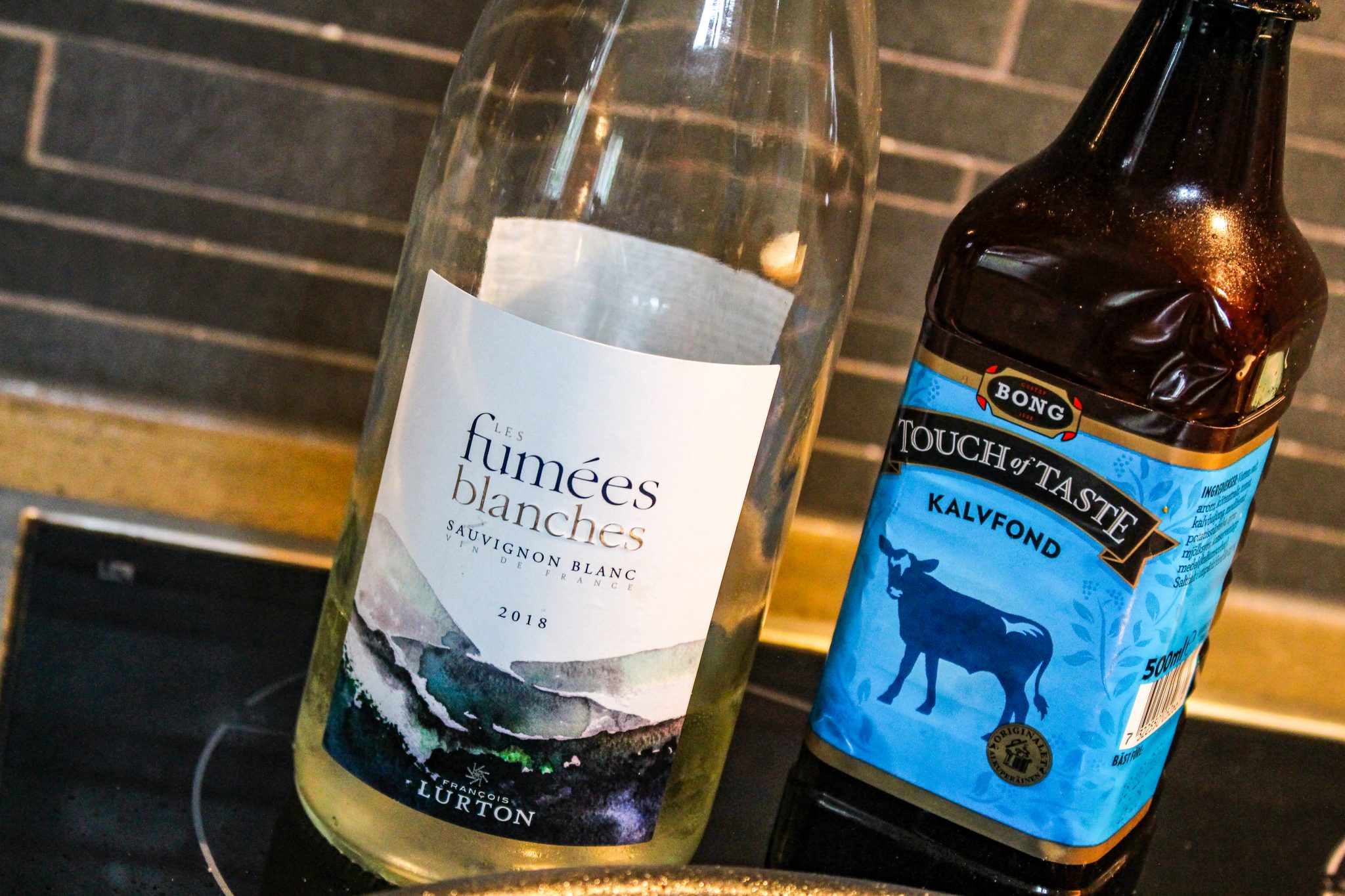 4) Häll i vin, vatten och kalvfond. Låt bräsera under lock på medelvärme i ca 5 minuter. (Ett av mina favoritvin är fumees blanches som är ett Sauvignon Blanc vin och smakar magiskt gott.)